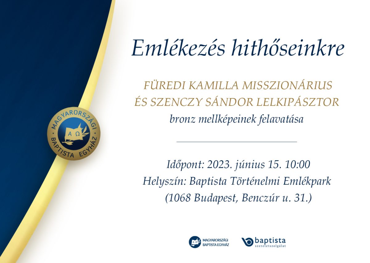 A Magyarországi Baptista Egyház és a Baptista Szeretetszolgálat szeretettel és tisztelettel hívja az érdeklődőket bronz mellképek avatására, amivel a magyarországi baptista közösség közelmúltjának két jeles alakja előtt tisztelgünk. Füredi Kamilla Afrikában szolgáló misszionáriusra és Szenczy Sándorra, a Baptista Szeretetszolgálat alapítójára emlékezünk.
