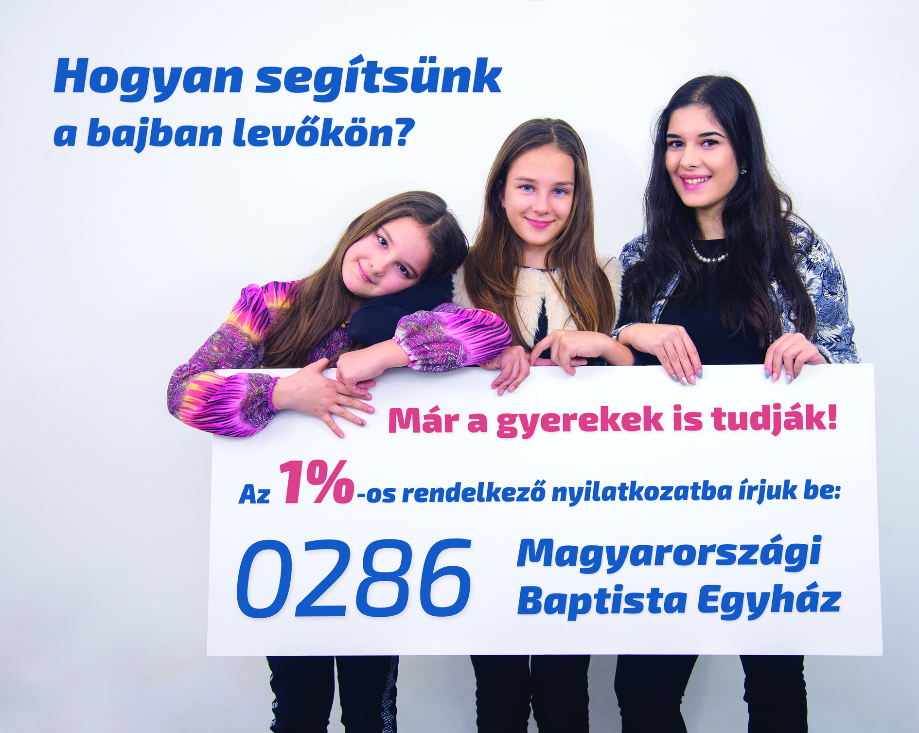 Hány percre van szükségünk egy asztalnál ülve ahhoz, hogy eredményesen segítsünk embertársainknak kilátástalan életük megoldásában, valamint a gyülekezetek missziójának anyagi támogatásában? Összesen néhány percre. Hogyan? Úgy, hogy mi magunk és ismerőseink is a Magyarországi Baptista Egyháznak (technikai számunk: 0286) rendelkezünk adónk 1%-áról.
