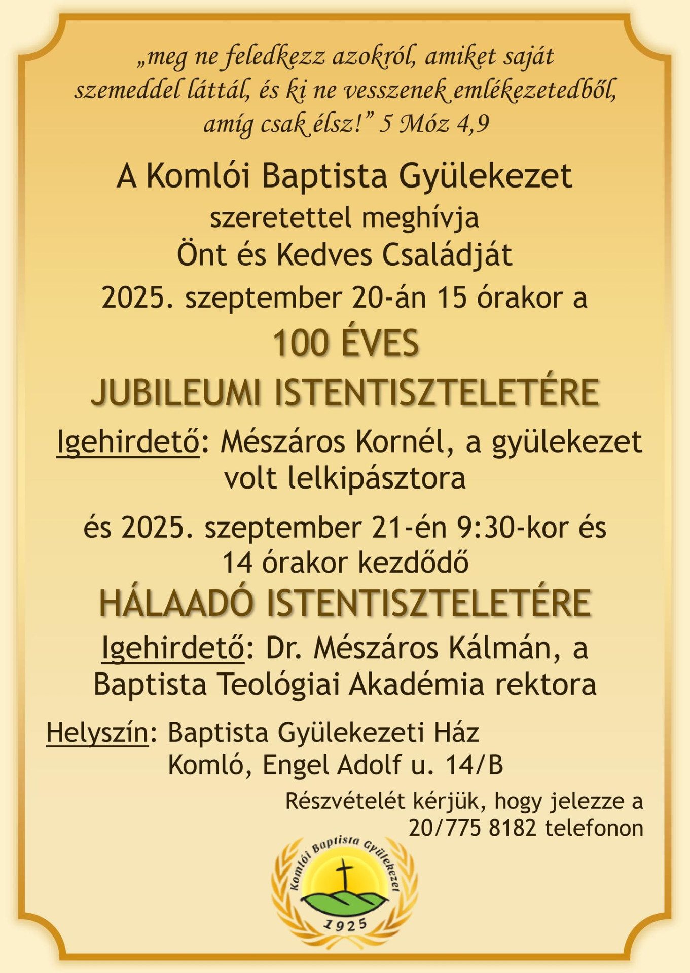 Végül az ünnepi, jubileumi istentiszteletekre szeretettel hívjuk mindazokat, akik hálásak az elmúlt 100 évért, akik részesei, formálói voltak, és akik velünk együtt örömmel emlékeznek és adnak hálát