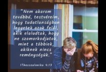 „13Nem szeretnénk, testvéreink, ha tudatlanok lennétek az elhunytak felől, és szomorkodnátok, mint a többiek, akiknek nincs reménységük. 14Mert ha hisszük, hogy Jézus meghalt és feltámadt, az is bizonyos, hogy Isten az elhunytakat is előhozza Jézus által, vele együtt. 15Azt pedig az Úr igéjével mondjuk nektek, hogy mi, akik élünk, és megmaradunk az Úr eljöveteléig, nem fogjuk megelőzni az elhunytakat. 16Mert amint felhangzik a riadó hangja, a főangyal szava és az Isten harsonája, maga az Úr fog alászállni a mennyből, és először feltámadnak a Krisztusban elhunytak, 17azután mi, akik élünk, és megmaradunk, velük együtt elragadtatunk felhőkön az Úr fogadására a levegőbe, és így mindenkor az Úrral leszünk. 18Vigasztaljátok tehát egymást ezekkel az igékkel!” (1Thessz. 4:13-18)