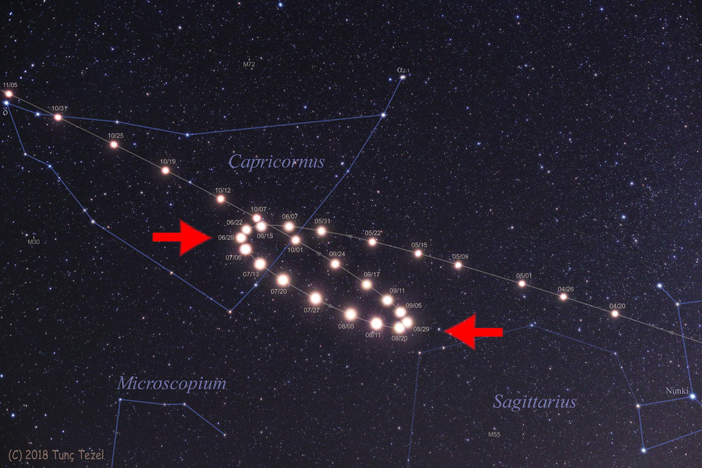 A másik nagyon fontos fogalom a stacionárius pont. Ez a kifejezés egy teljesen szokványos csillagászati jelenségre utal. Mivel a bolygók, kisbolygók, üstökösök keringnek a Nap körül, ezért a „normál” csillagok között ők mozognak. Ez a mozgás azonban nem egyenletes, ennek oka, hogy közben a Föld is kering a Nap körül. A kétfajta mozgás eltérő látószögeket eredményez, ezért a Földről nézve minden bolygó úgynevezett hurokmozgással (epiciklus) látszik mozogni az égen. Ha napról napra követünk egy bolygót, és berajzoljuk egy csillagtérképre, akkor ugyanazt látjuk, mint az 1. ábrán: ezen a fotósorozaton a Mars egyéves „hurokmozgása” látható. Stacionárius pontnak azt a két pontot (piros nyíllal jelölve a képen) nevezzük, mikor a bolygó elérkezik a hurok két szélének valamelyikéhez: ekkor mozgása lelassul, s napokig szinte egy helyben áll. Azaz „megáll” a csillagok között. Máté tehát ezt a jelenséget írja le eredetileg, nem pedig azt, hogy egy csillag repült az égen, és megállt Mária és József háza fölött! A későbbi fordítók valószínűleg nem értették teljesen a csillagászati szakkifejezést, ezért adtak egyszerűbb megfogalmazást a csillag megállására vonatkozóan. E két csillagászati fogalom megértése fontos, az egész történet megértése szempontjából.
