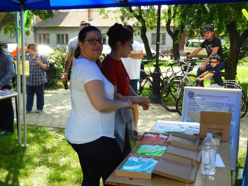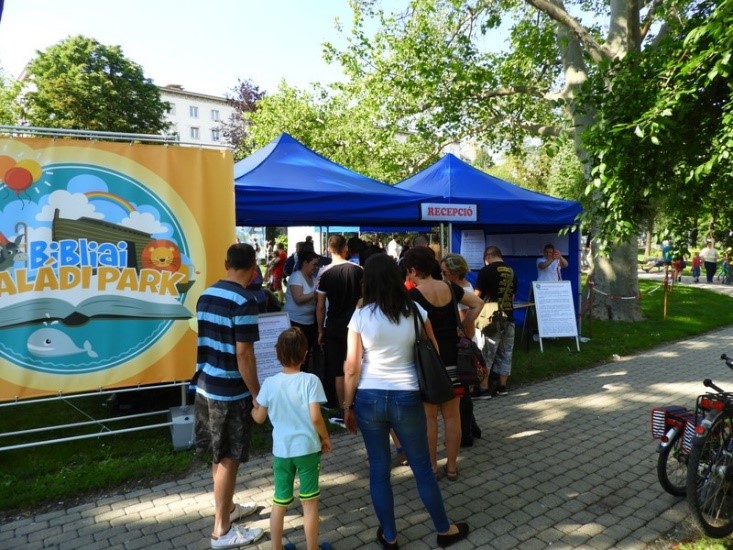 A Bibliai Családi Park az imaházunk előtti parkban lett felállítva, és az imaház ajtajai nyitva álltak bárki előtt. Itt A magyarországi baptizmus története címmel egy kiállítást tekinthettek meg az érdeklődők, miközben az előterében kreatív kézműves foglalkozásokat tartottak a testvérnők. Örömünkre szolgált, hogy volt néhány látogatónk a „híd” túloldalán is, és kialakulhatott néhány mélyebb beszélgetés is köztünk és az érdeklődők között. Nagy mennyiségben fogytak az ingyenes keresztény kiadványok is (Mai Ige, Győzelem Sorozat, Family Magazin, a Harmat kiadó ismertetői stb.), amelyeket a park kijáratánál helyeztünk el.