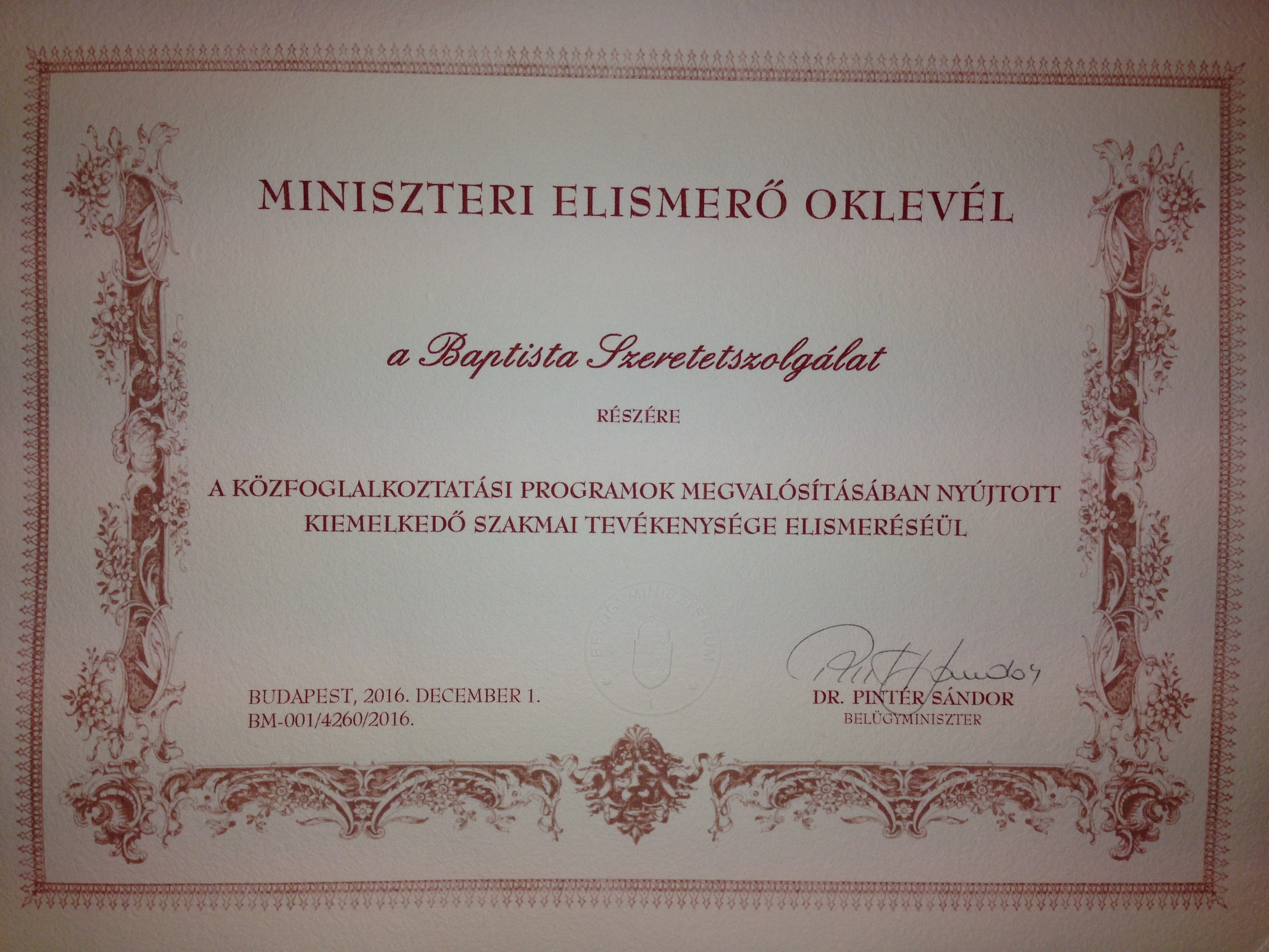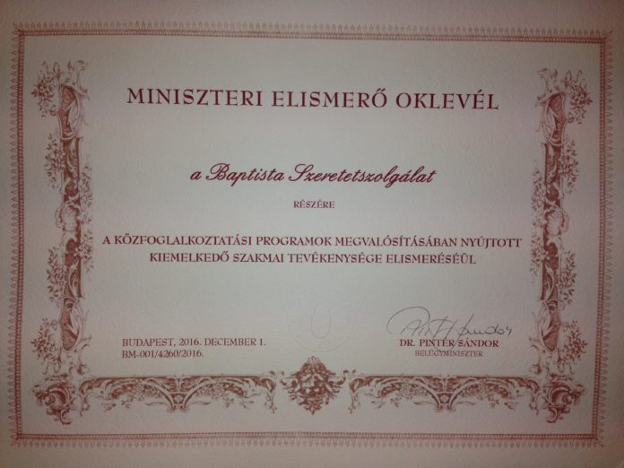 A Baptista Szeretetszolgálat a maga 48 telephelyével országos közfoglalkoztatóként kapta az elismerést. Az ezt tanúsító oklevelet Hári Tibor ügyvezető igazgató és Szanyi Gergely programvezető vette át az ünnepségen.