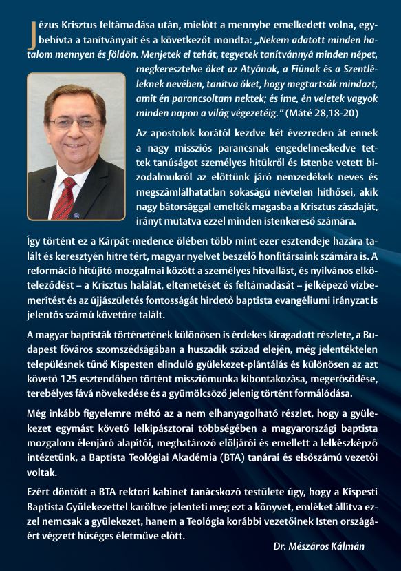 Ezért döntött a BTA rektori kabinet tanácskozó testülete úgy, hogy a Kispesti Baptista Gyülekezettel karöltve jelenteti meg ezt a könyvet, emléket állítva ezzel nemcsak a gyülekezet, hanem a teológia korábbi vezetőinek Isten országáért végzett hűséges életműve előtt.”