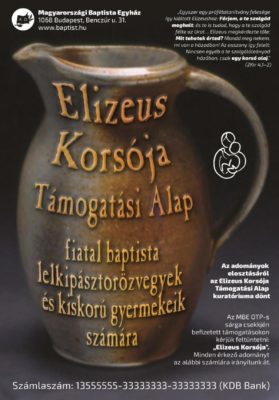 A Magyarországi Baptista Egyház Országos Tanácsa továbbra is az országos közösség figyelmébe ajánlja az Elizeus Korsója Támogatási Alapot, amely fiatal baptista lelkipásztorözvegyek és kiskorú gyermekeik támogatását végzi.