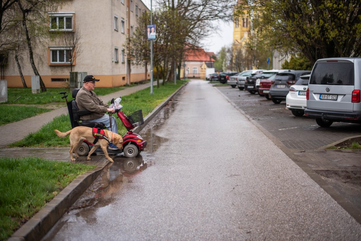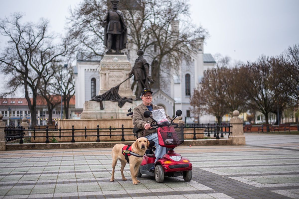 Az interjút követően elindultak bevásárolni, mi pedig elkísértük őket egy darabon. Akkor már meglepően gyors tempóban haladtak, mert beült a mopedjébe, Frappé pedig pórázon kísérte. Azzal kezdtek, hogy a kutya szabadon mozgott egy kiadósat, utána Hajdúböszörmény főterén át jutottak el az üzletbe.