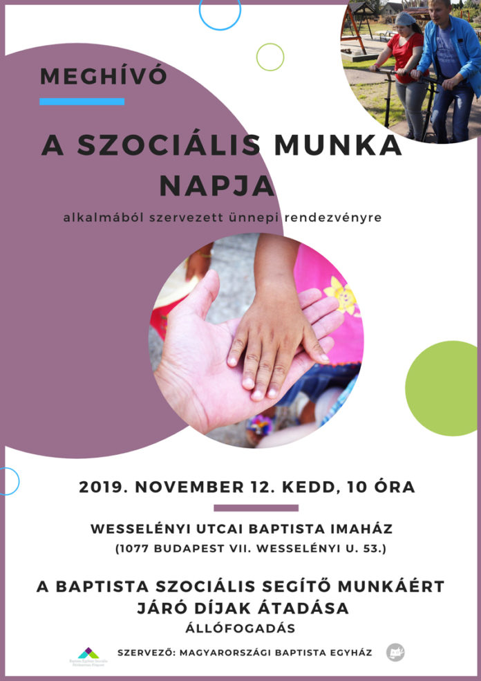 A szociális munka napja alkalmából ünnepi rendezvényt tart a Magyarországi Baptista Egyház 2019. november 12-én, kedden 10 órától a Wesselényi Utcai Baptista Imaházban, ahol a baptista szociális segítő munkáért járó díjak kerülnek átadásra!