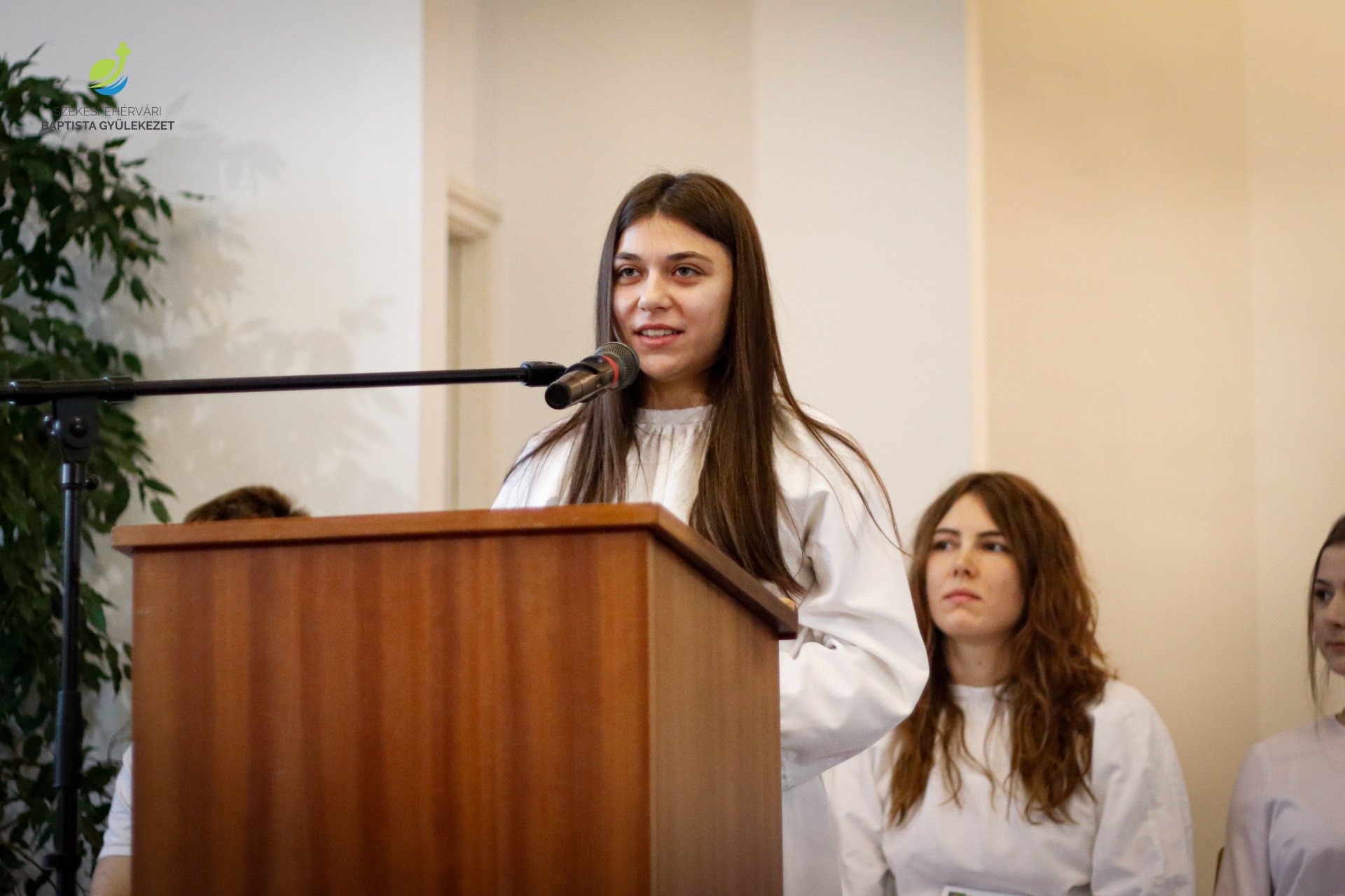 Majd Csürke Laura bizonyságát ismerhettük meg. Laura gyermekkorában hittan órákról ismerte az Úr Jézust, de ez még nem az az idő volt, amikor Isten magához hívta volna. Megtéréséhez egy hosszú folyamat vezetett. 2024. februárjában elkezdett ifire járni, majd istentiszteleti alkalmakra is eljött. Ekkor még a varázslásban hitt, de mindig nyitott szívvel hallgatta Isten igéjét. 2024. augusztusában bibliaolvasás közben szólította meg Isten és lányává fogadta. Attól a naptól fogva tudja, hogy az egyetlen élő Isten nem más, mint az Úr Jézus Krisztus, akit az örökkévalóságig nem csak követni, de dicsérni és magasztalni akar. Laura bemerítési igéje: „Ő szabadított meg minket a sötétség hatalmából, és ő vitt át minket szeretett Fiának országába, akiben van megváltásunk és bűneink bocsánata.” (Kolossé 1:13-14).
