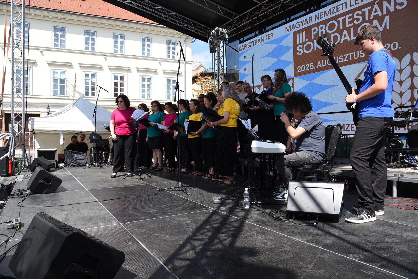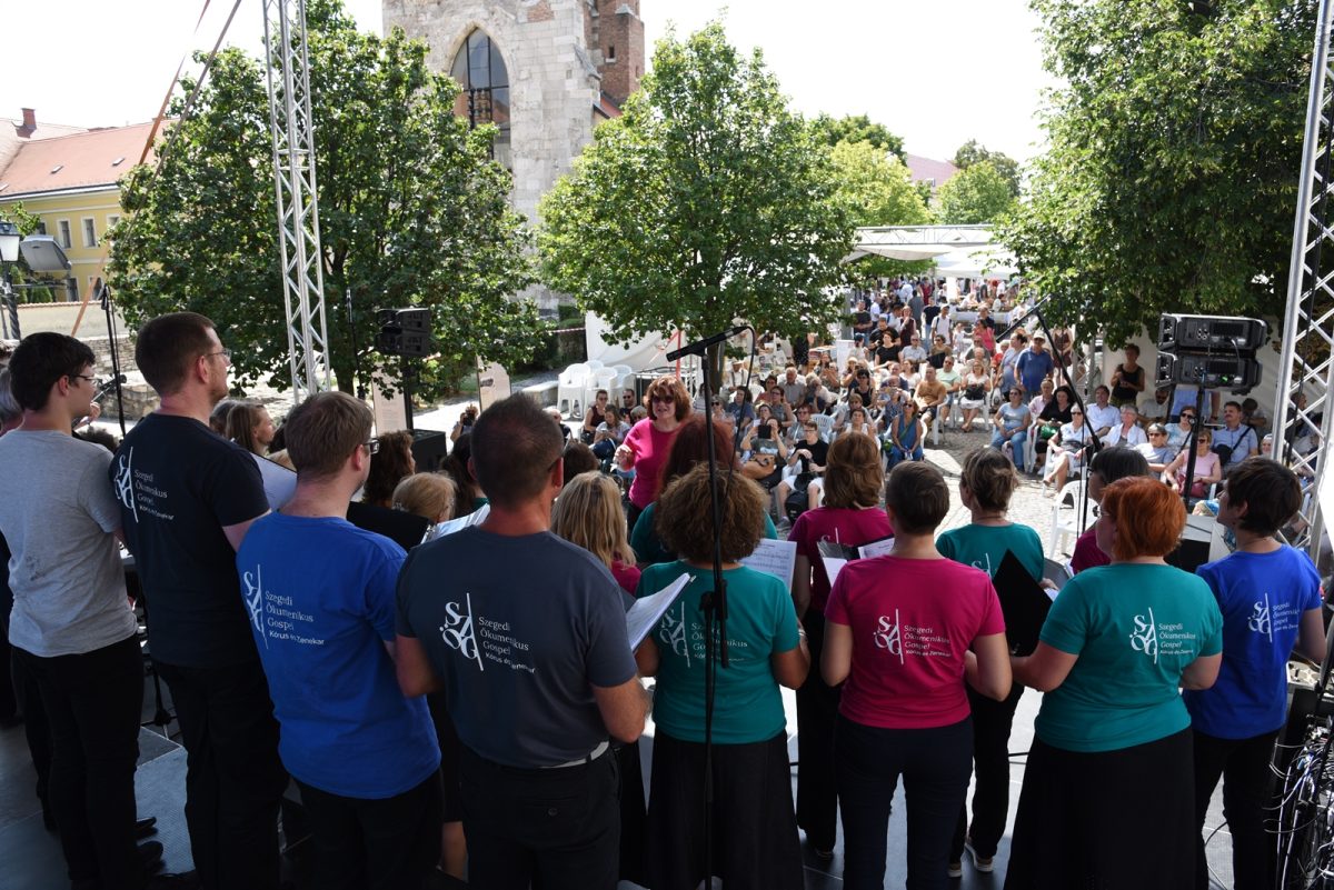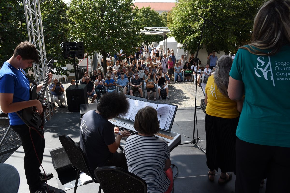 Közben a Kapisztrán téren a Szegedi Ökumenikus Gospel Kórus és zenekar lépett színpadra. A szegedi baptista gyülekezetből indult formáció alapító karnagya és művészeti vezetője Baloghné Kovács Magdolna. Repertoárjukban gospel, spirituálé és afrikai dallamok szólaltak meg – a népes közönség is be-bekapcsolódott a koncert ismertebb énekeibe.