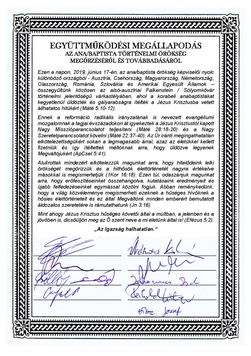 Ezen a napon, 2019. június 17-én, az ana/baptista örökség képviselői nyolc különböző országból – Ausztria, Csehország, Magyarország, Németország, Olaszország, Románia, Szlovákia, Amerikai Egyesült Államok – összegyűltünk közösen az alsó-ausztriai Falkenstein/Sólyomkővár történelmi jelentőségű várkastélyában, ahol a korabeli anabaptistákat kegyetlenül üldözték és gályarabságra ítélték a Jézus Krisztusba vetett állhatatos hitükért (Mt 5,10–12).