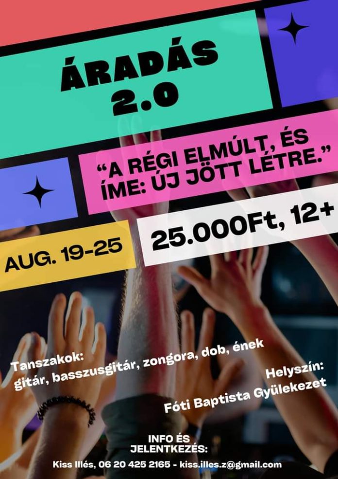 Második alkalommal kerül megrendezésre „Áradás – dicsőítő tábor”-unk, ahol a táborozók megismerkedhetnek a keresztény könnyűzenével, hangszeren tanulhatnak vagy fejleszthetik tudásukat, megismerhetik, milyen csapatban dicsőíteni, növekedhetnek lélekben és ismeretben.