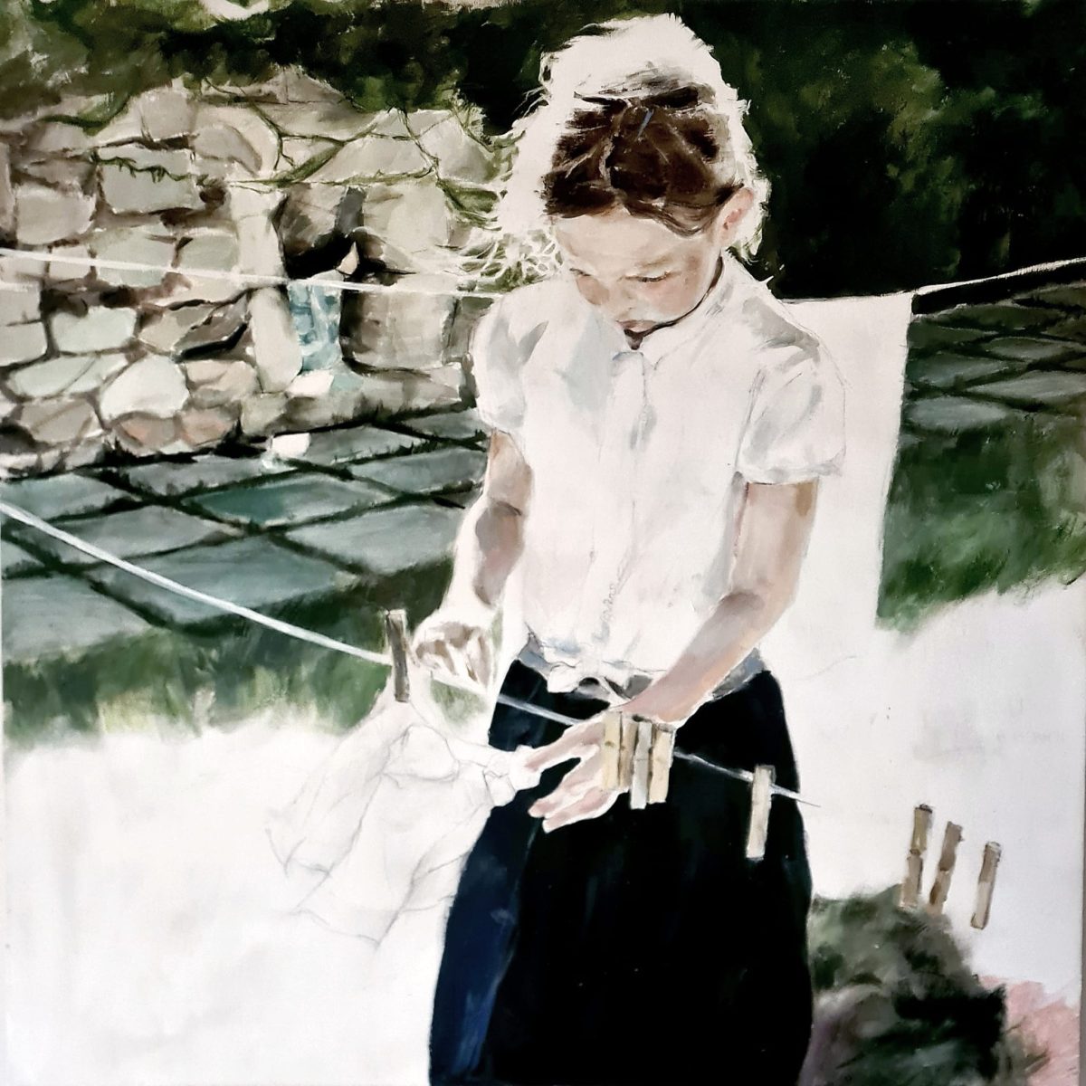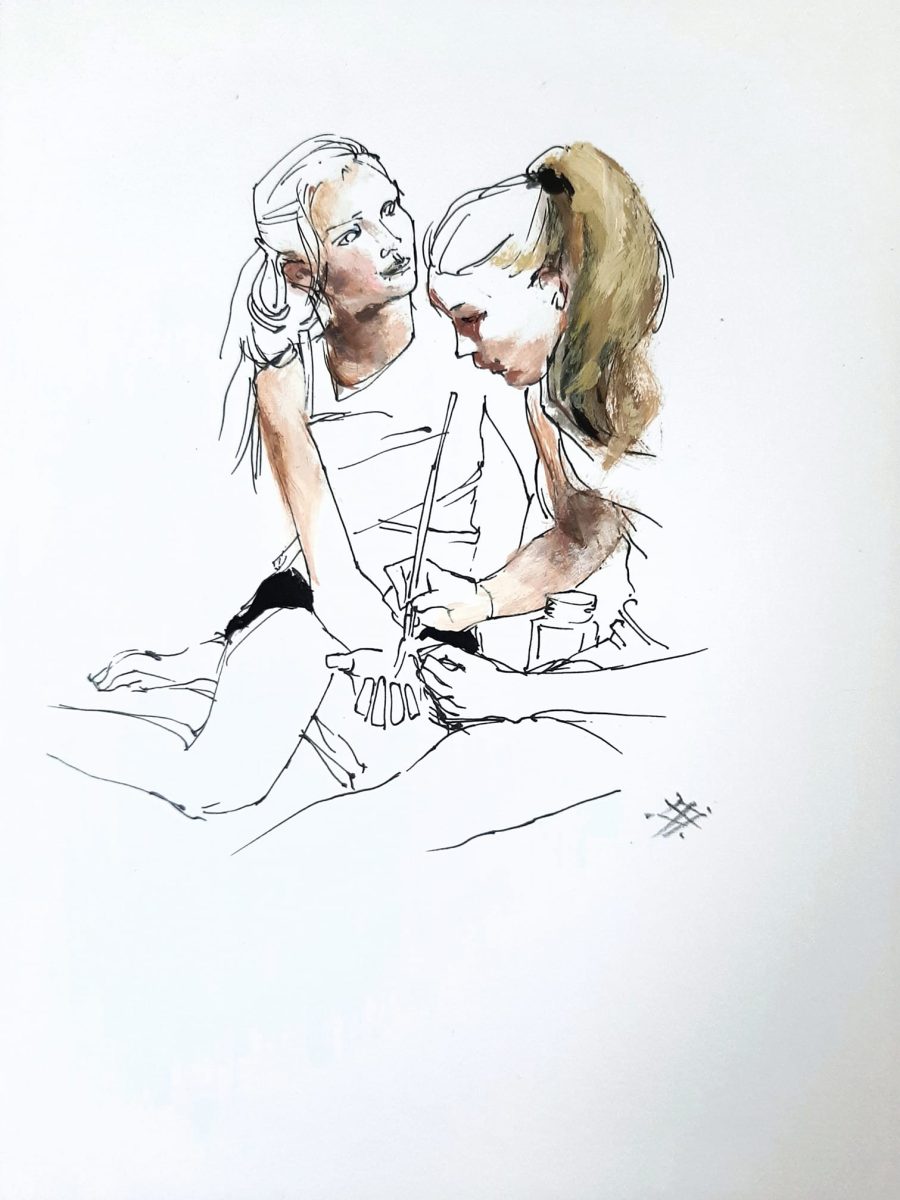 Ez jó kérdés, mert igazából a gyerekeim jelenléte generálta bennem azt, hogy elkezdjek mellettük alkotni. Úgy kezdődött, hogy ruhákat, játékokat kezdtem varrni nekik. Rajzolni nem nagyon volt időm mellettük, de annak a feszültsége feloldódott bennem, hogy mást is csináljak a család mellett akkor is, ha ők a legfontosabbak nekem. Viszont nagyon kellett vigyázni, hogy ne szaladjon el a ló, vagyis az idővel jól kellett gazdálkodni. Ez nekem nem mindig sikerült, viszont később az én drága párom pont ebből látta, hogy mennyire fontos ez számomra, és bíztatott, hogy tanuljak tovább, végezzem el a Képzőművészeti Egyetemet is. Jelentkeztem és felvettek. Szerencsére nem kellett olyan sűrűn bejárni és így a három gyerek mellett a férjem támogatásával el is tudtam végezni.