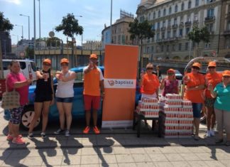 A rendkívüli melegre való tekintettel a Baptista Szeretetszolgálat július 20-án, csütörtökön 14-től 15 óráig hűtött üdítőitalt osztott a fővárosban a Nyugati téren, a WestEnd üzletközpont előtt.
