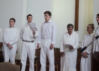 2015.szeptember 13.-án délelőtt már a kezdés előtt a fúvósok kíséretével együtt énekelt az ünneplő gyülekezet azzal a két fehérruhással, akik újjászületésükről és új életükről a bemerítés cselekedetével is vallást tettek.