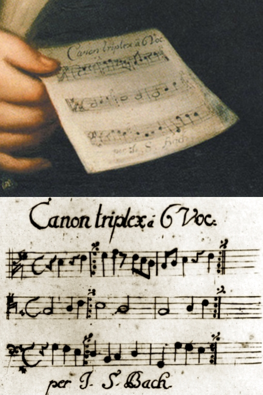 Nézzük meg Elias Gottlob Haussmann festményét Bachról, 1746 (majd saját festményét másolva 1748), talán tegyük karakteresebbé a fejet, sőt nézzük meg, hogy milyen lenne Bach egy fényképen? De az is érdekelhet minket, hogy mit tart a kezében? Jól láthatóan a BWV hatszólamú kánonjának kottáját tartja a kezében.