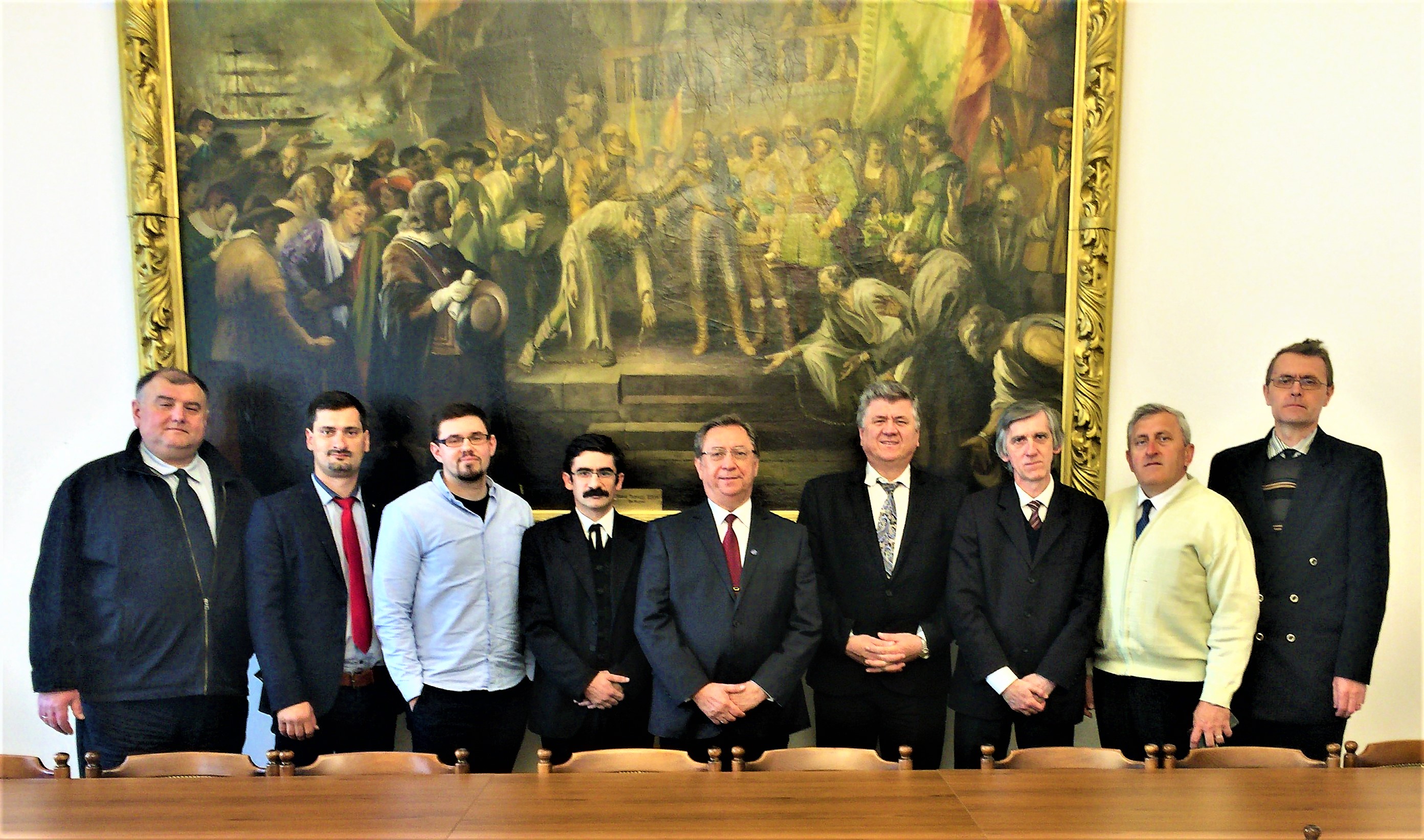 Dóczé Bálint (Felvidék), Nagy-Kasza Dániel (Kárpátalja), Bacsó Benjámin (Magyarország), Kiss Lehel (Erdély), dr. Mészáros Kálmán (Magyarország), dr. Borzási István (Erdély), Bereczki Lajos (Magyarország), Kiss Zoltán (Erdély) és Kelemen Sándor Tomi (Erdély). A csoportkép mögötti festmény címe: Ruyter holland admirális az Eendracht hajón fogadja a Nápolyban kiszabadított magyar gályarab prédikátorokat. Festette: Tamássy Miklós