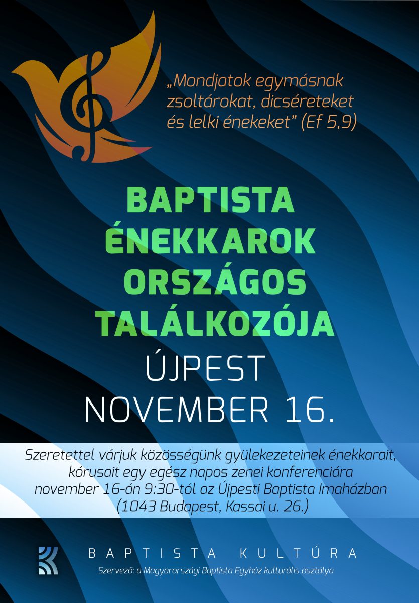 November 16-án, szombaton, a Baptista Művészeti Napok nyitónapján 10 és 17 óra között kerül megrendezésre a baptista énekkarok országos találkozója (BÉOT) az Újpesti Baptista Imaházban. Szeretettel várjuk az énekkarokat és a vendégeket egyaránt!