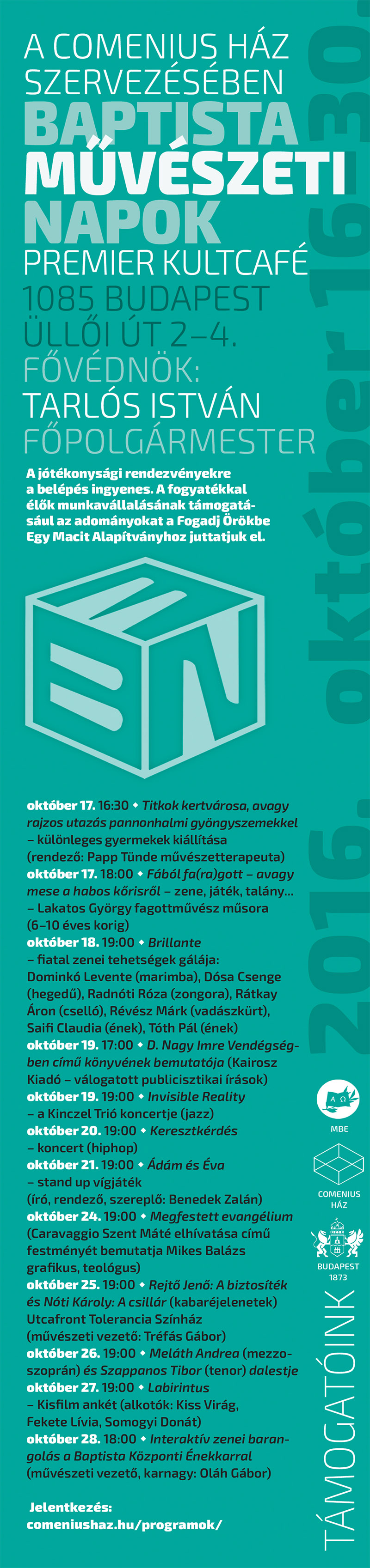 A Baptista Művészeti Napok budapesti rendezvénysorozata 2016. október 17-én veszi kezdetét a Kálvin téri Premier KultCaféban (1085 Budapest, Üllői út 2–4.). Két héten keresztül esténként ragyogó talentumú művészeink lépnek színpadra és mutatják be tevékenységüket a legkülönfélébb műfajokban. Jöjjünk el, töltsünk együtt egy-egy nagyszerű estét!
