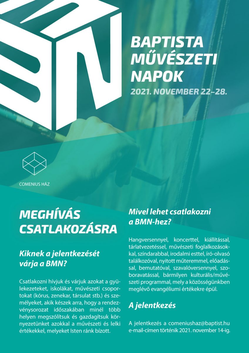 Szeretettel hívjuk és várjuk a baptista gyülekezeteket, iskolákat, művészeket, művészeti csoportokat és mindenkit, aki szeret a művészetekkel foglalkozni, az idén hatodik alkalommal megrendezésre kerülő Baptista Művészeti Napok 2021. november 22–28-ig tartó országos rendezvénysorozatában való részvételre. Részletek a comeniushaz.hu oldalon. Üdvözlettel a Comenius Ház munkatársai