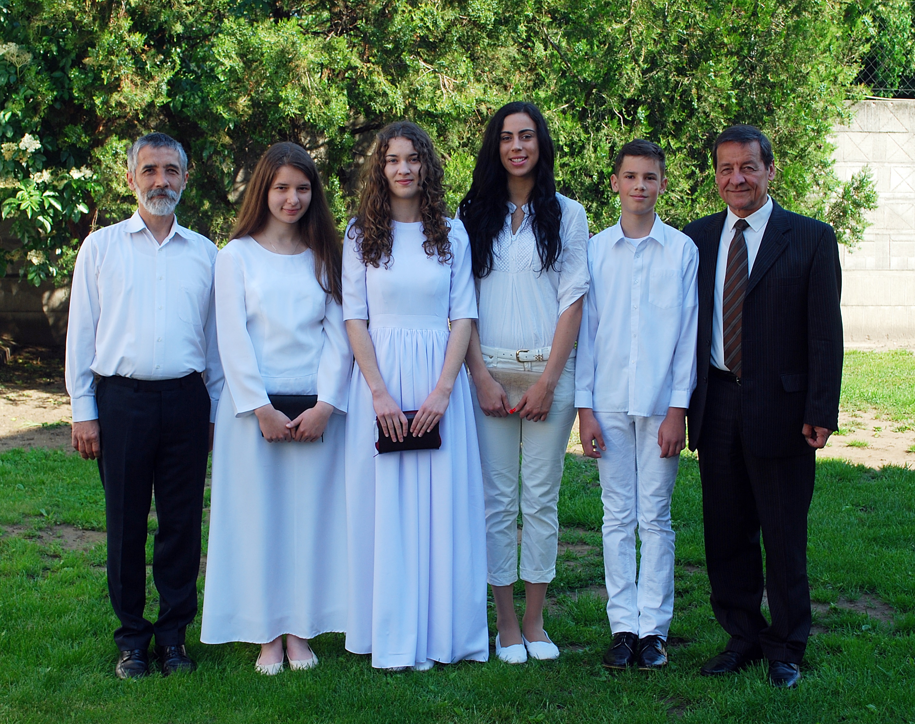 A képen szerepelnek balról jobbra: Pető Albert lelkipásztor, Kallos-Balogh Piroska, Ghirasin Anna, Darai Lilla Csenge, Durbák Benjámin és Dobos Péter gyülekezetvezető