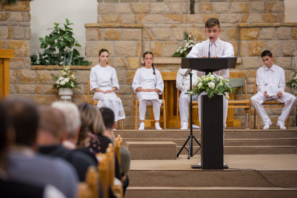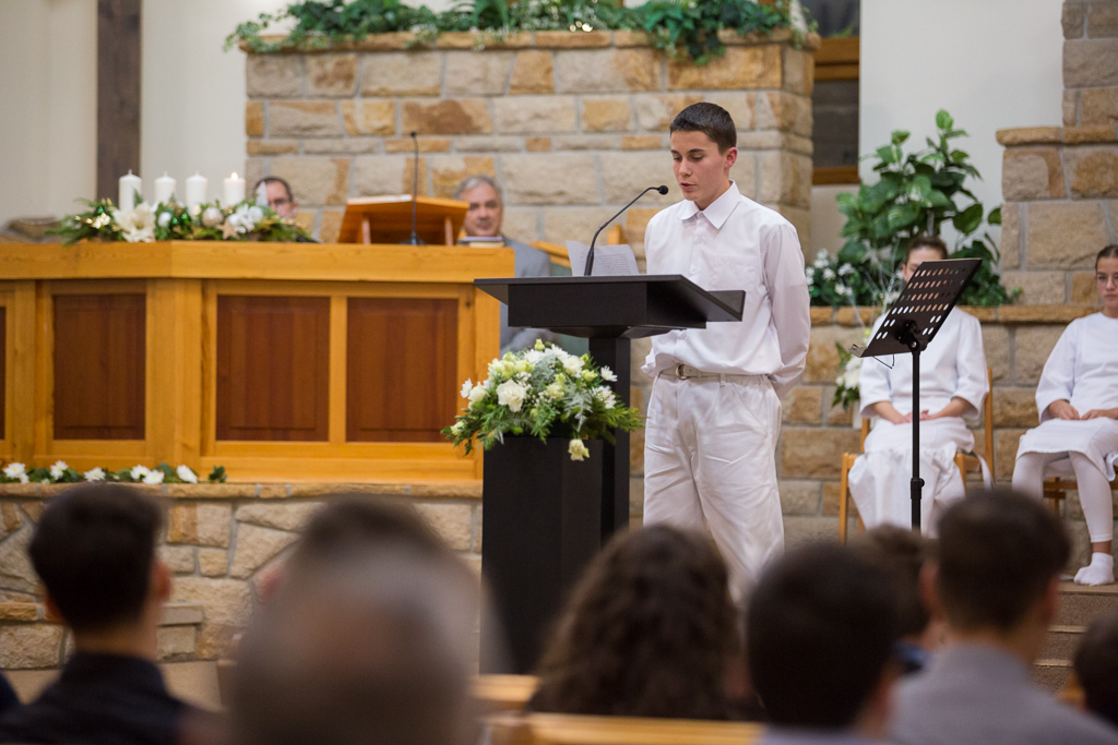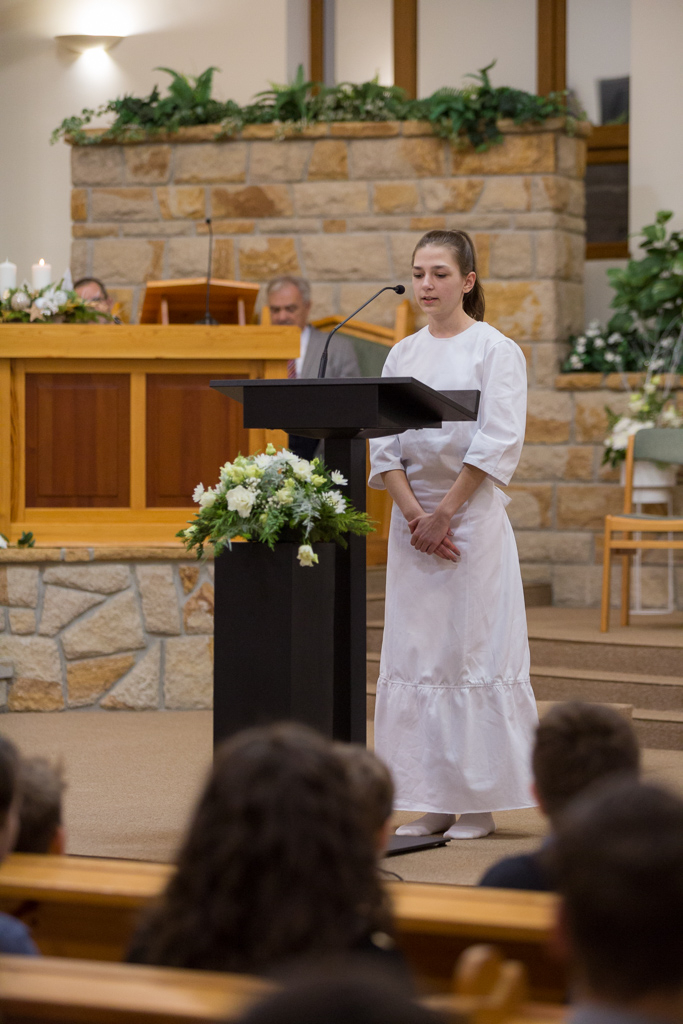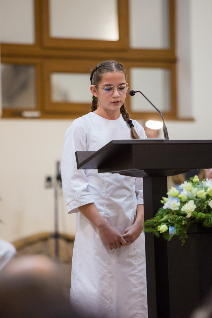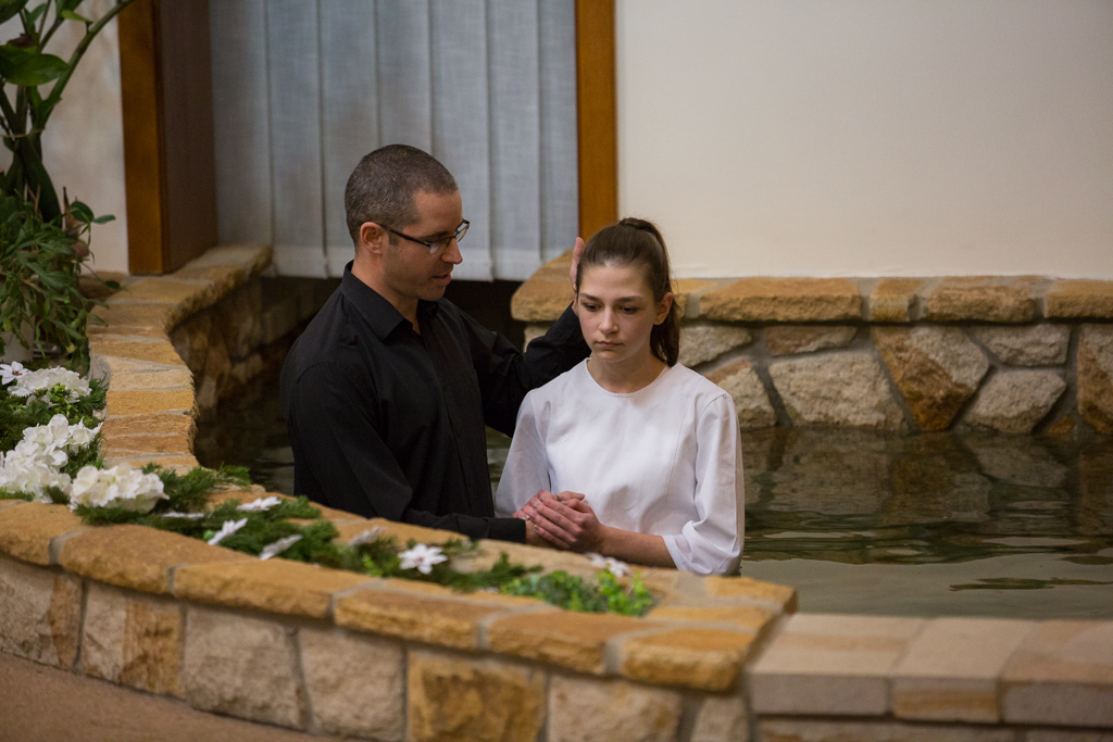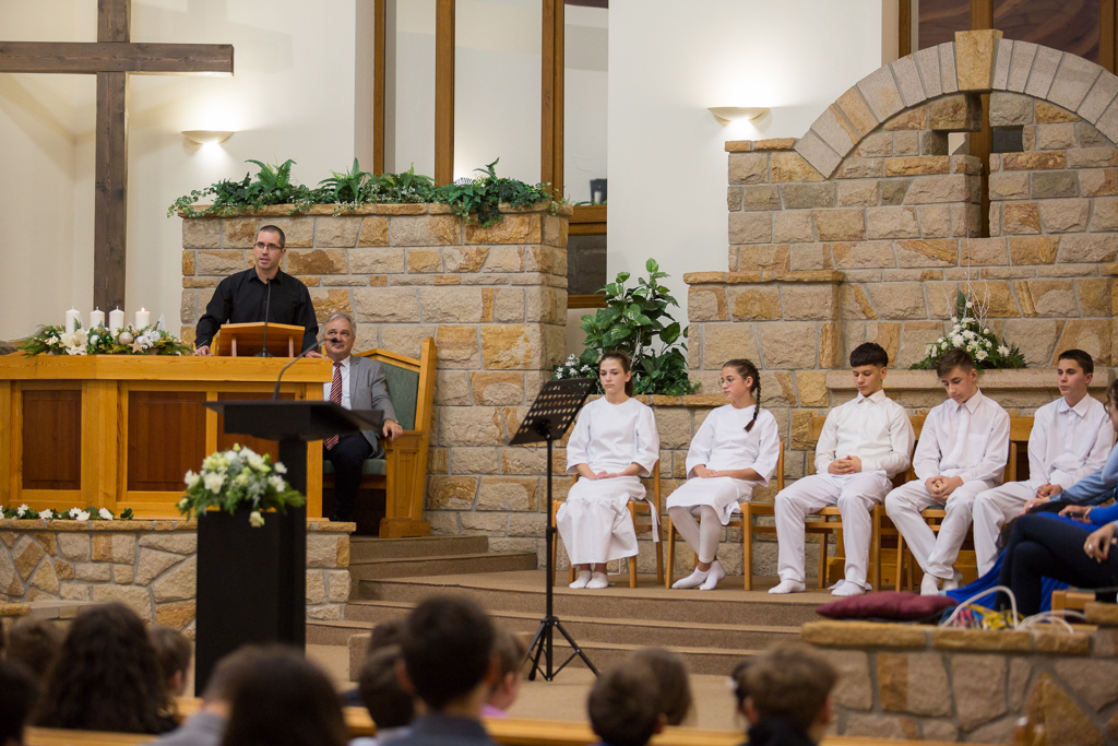 Az istentiszteletet a 21. ének (Hálás szívvel áldunk…) hangjai és Meláth Attila lelkipásztorunk imádsága nyitották meg. Ezután következtek a bemerítkezők. Elsőként Tóth Flóra tett bizonyságot arról, hogyan ismerte fel Jézusban személyes Megváltóját a Jn 3,16 („Mert úgy szerette Isten a világot, hogy az ő egyszülött Fiát adta, hogy valaki hiszen őbenne, el ne vesszen, hanem örök élete legyen”) alapján, majd Király Sára következett, akit az Ige arra indított, hogy merje megvallani a hitét mások előtt. Ez a felismerés vezette őt arra, hogy elfogadja Isten megbocsátó kegyelmét és vezetését. Bizonyságtételét az 1Tim 4,12 versével zárta, mely szerint „Senki meg ne vessen ifjú korod miatt, hanem légy példája a hívőknek beszédben, magaviseletben, szeretetben, hitben, tisztaságban”.