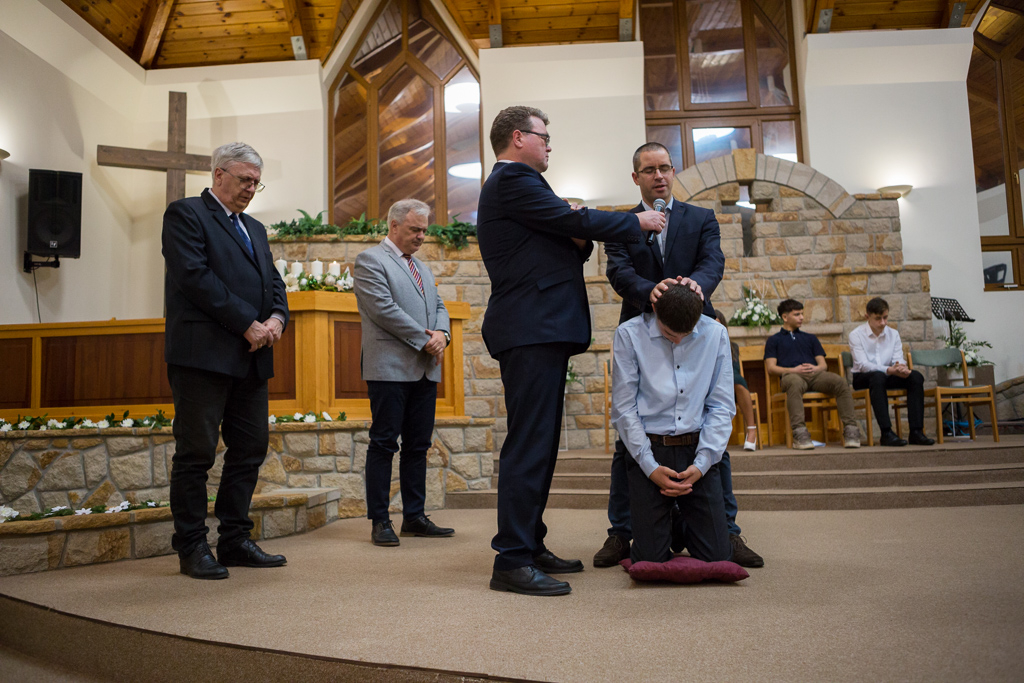 Közös éneklés után kézrátétellel imádkoztak a bemerítkezőkért gyülekezetünk elöljárói, név szerint Lakati Péter, Meláth Attila, Gáspár Botond és Tóth Zoltán, aki a közösség vezetőjeként külön is köszöntötte a fiatalokat a gyülekezeti tagok soraiban. Az ifjúság is üdvözölte őket egy-egy dallal, majd az istentisztelet kötött részét a 146. ének (Ha zendül az Úr Lelke…) zárta.