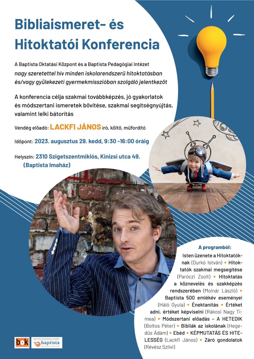 A Baptista Oktatási Központ és a Baptista Pedagógiai Intézet nagy szeretettel hív minden iskolarendszerű hitoktatásban és/vagy gyülekezeti gyermekmisszióban szolgáló jelentkezőt a 2023-as Bibliaismeret- és hitoktatói konferenciára.