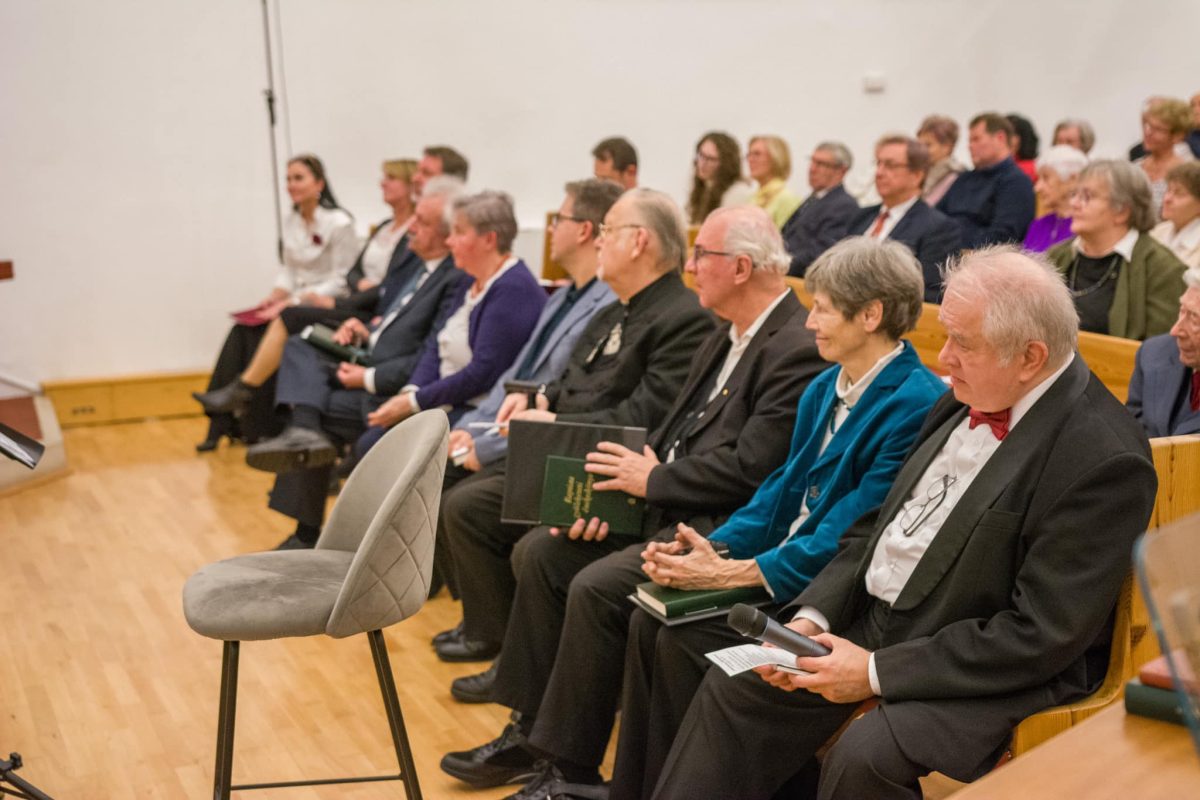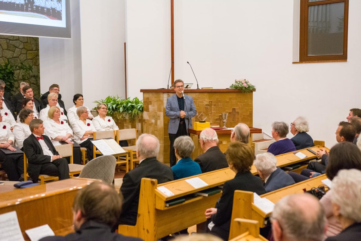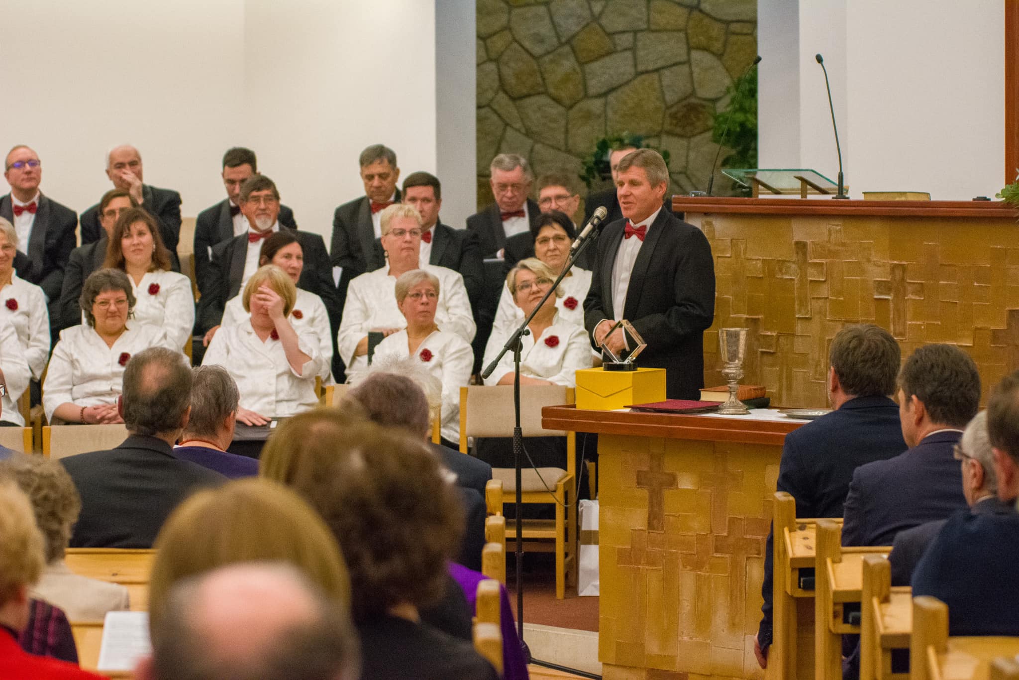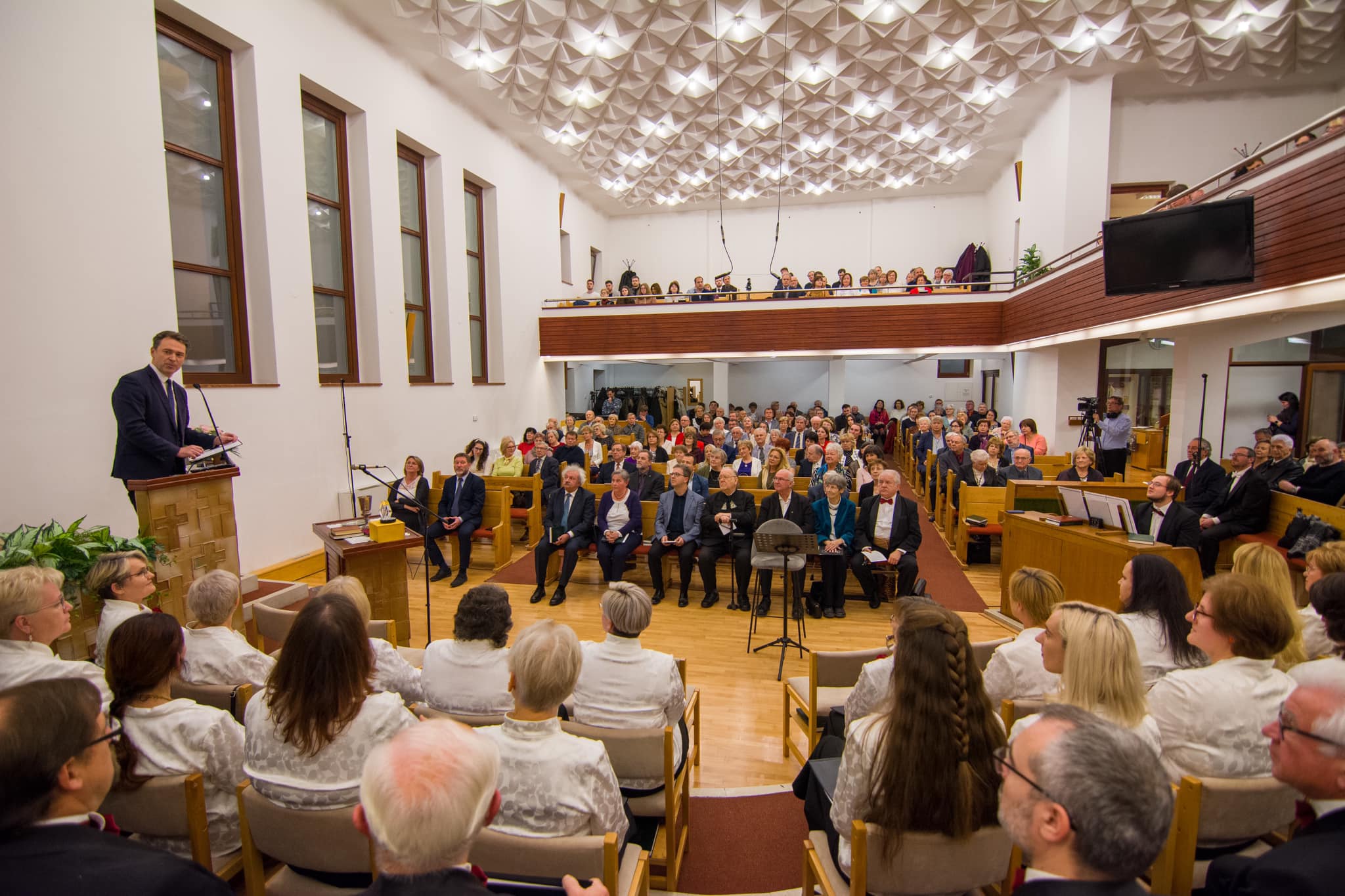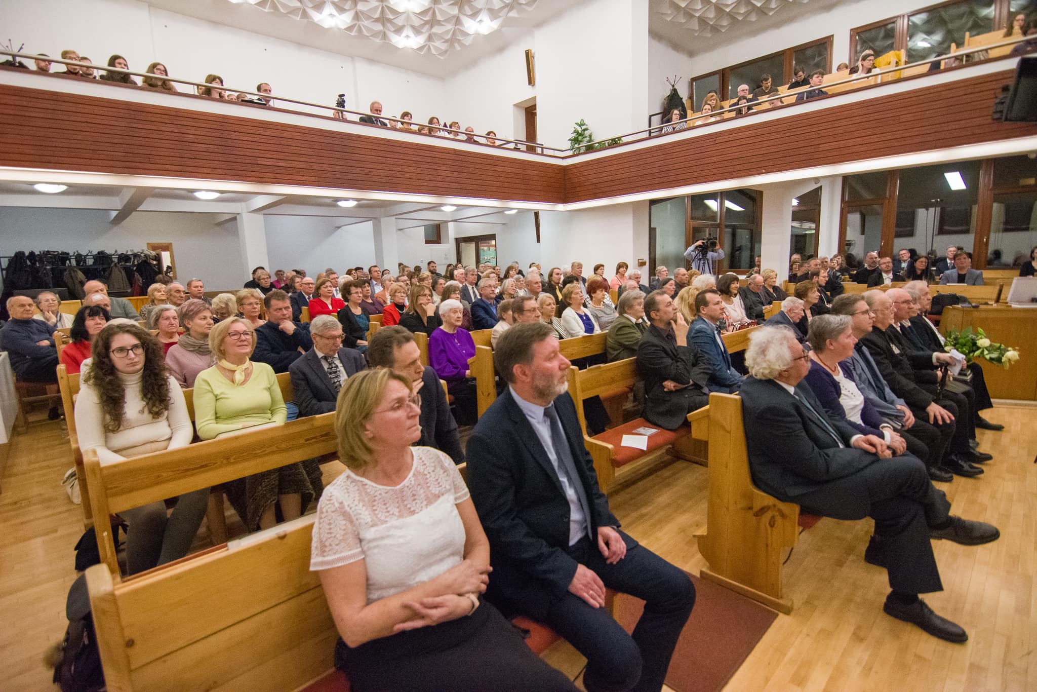 Az Újpesti Baptista Gyülekezet imaházában teljesen megteltek a padsorok november 20-án, vasárnap 17 órára, amikor az istentisztelet kezdetét vette. Mészáros Kornél testvér betegsége miatt Papp Szabolcs lelkipásztorra, a kulturális és sajtóosztály vezetőjére bízta a házigazdai teendőket, aki örömteli jókedvvel és üdítő humorával köszöntötte az egybegyűlteket, majd imádsággal kezdte meg az alkalmat. A kezdőének után Murányi-Kovács Anita kulturális munkatárs vette át a program levezetését. A nyitó hangversenyen díszvendégként részt vett számos neves keresztény zeneművész, név szerint Beharka Pál orgonaművész, zeneszerző, a központi énekkar egyik alapító tagja; Kovács Arthur szintén alapító tag; Berkesi Sándor Kossuth-díjas karnagy; Kamp Salamon Liszt Ferenc- és Kossuth-díjas karmester; Sapszon Ferenc, a Nemzet Művésze, Kossuth- és Liszt Ferenc-díjas karnagy, zeneszerző; és Horváth Gábor karmester, az LFZE docense. Rajtuk kívül jelen voltak még a kórus egykori tagjai, a korábban művészeti díjjal kitüntetett testvérek és Tóth Sámuel Csaba karmester, korrepetitor is, aki az egyik kórusművet zongorán kísérte.