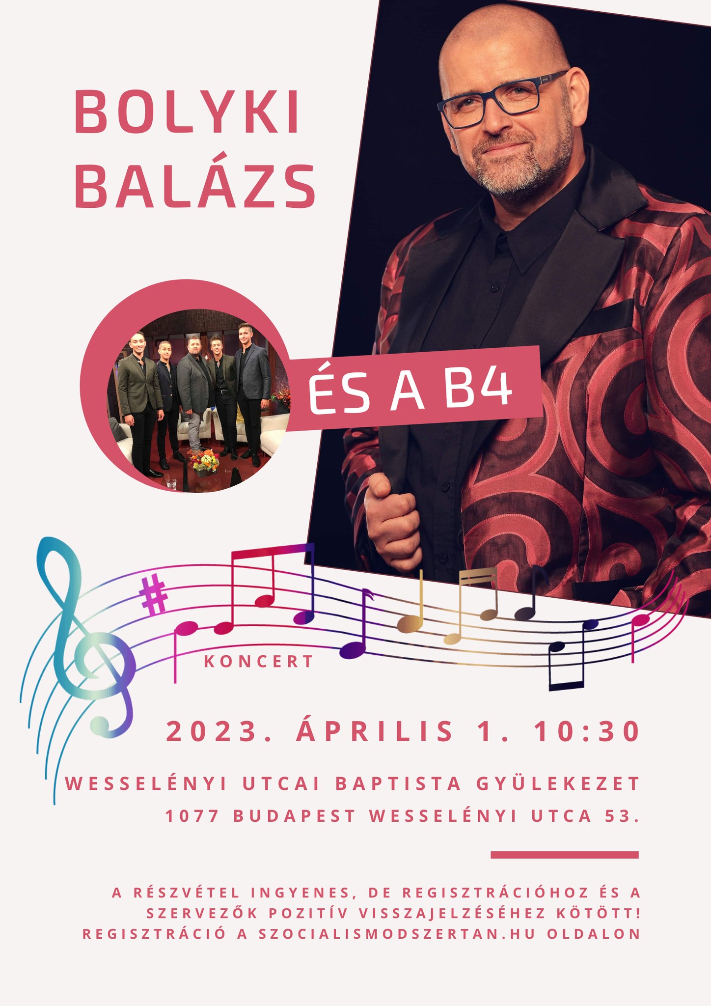 A Baptista Egyházi Szociális Módszertani Központ koncertet szervez a baptista fenntartásban működő nevelőszülői hálózatban élő gyerekeknek április 1-én, szombaton 10:30-tól a Wesselényi Utcai Baptista Imaházban (1077 Budapest, Wesselényi u. 53.). A fellépő Bolyki Balázs és fiai, a B4 formáció.