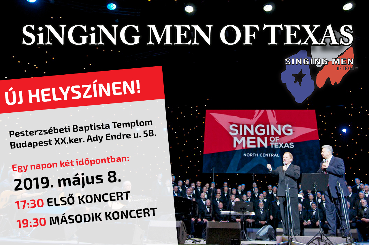 Örömmel értesítünk mindenkit, hogy a Singing Men of Texas koncert helyszíne megváltozott! Az új helyszín Pesterzsébeti Baptista Imaház, címe: 1203 Budapest, Ady Endre utca 58.