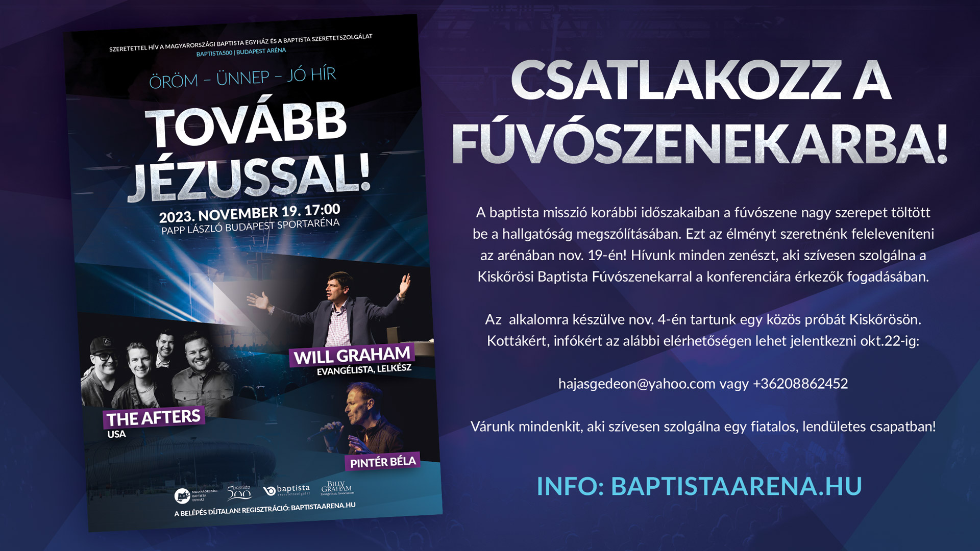 A baptista misszió korábbi időszakaiban a fúvószene nagy szerepet töltött be a hallgatóság megszólításában. Ezt az élményt szeretnénk feleleveníteni az arénában november 19-én!