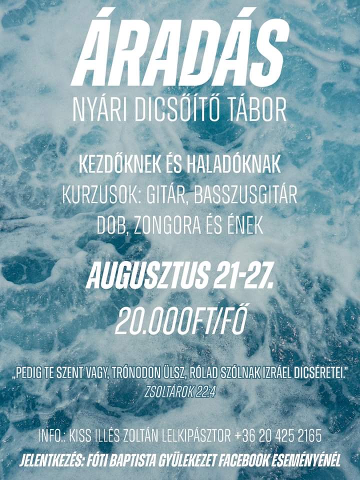 Szeretettel várunk nyári könnyűzenei dicsőítő táborunkba, amit augusztus 21–27. (hétfő–vasárnap) között a fóti baptista imaházban tartunk (Fót, Deák F. u. 3.).