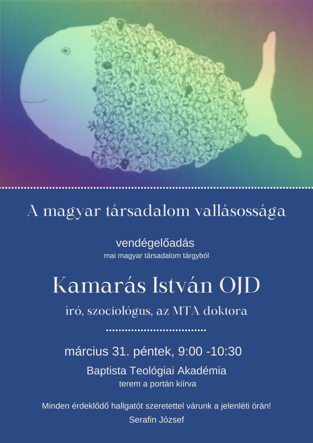 A Baptista Teológiai Akadémián a „mai magyar társadalom” tantárgy keretében időnként vendég előadók meghívására kerül sor. A soron következő előadó dr. Kamarás István író, szociológus, az MTA doktora. Az előadás címe: A magyar társadalom vallásossága. Az előadás időpontja március 31. 9:00–10:30 (a teremszám a portán lesz kiírva). Az előadás nyitott, minden érdeklődőt szeretettel várunk!