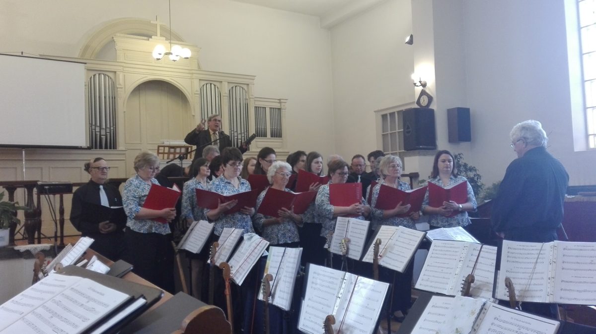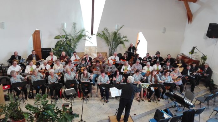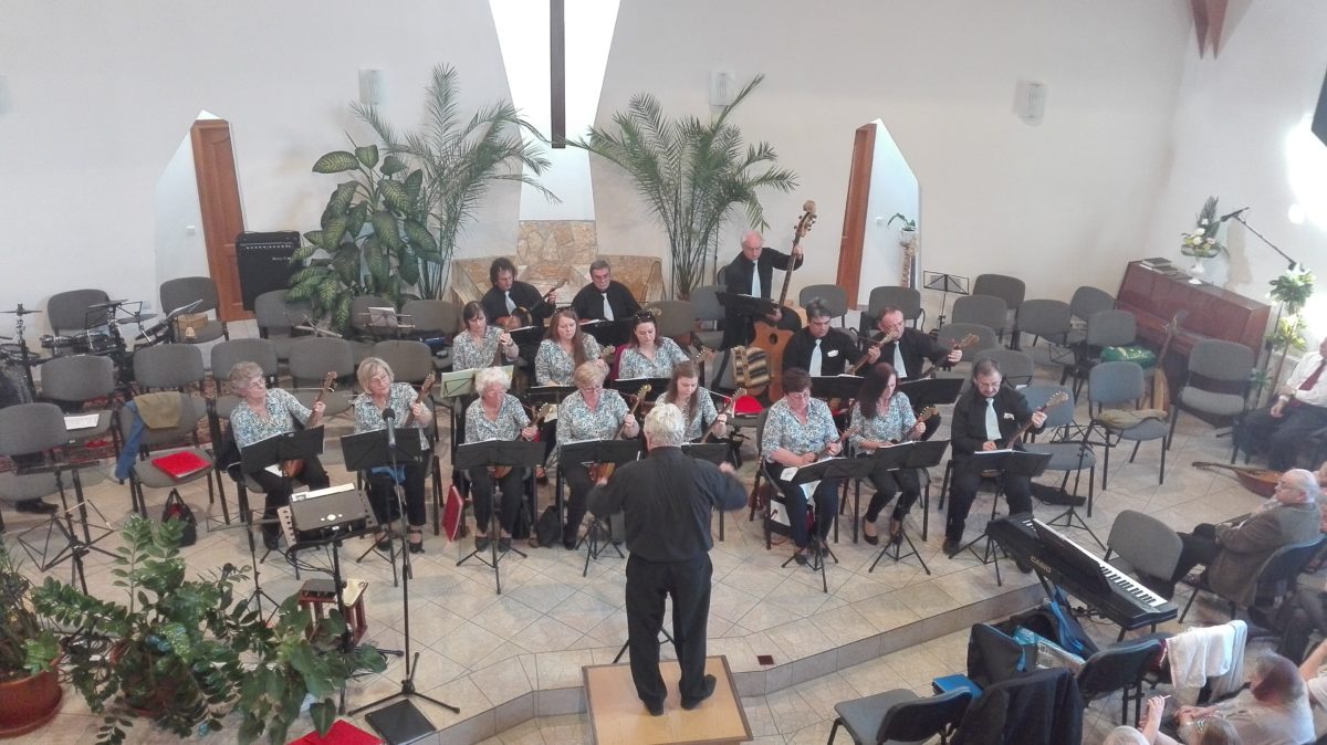 Délután a közös körzeti alkalomra az impozáns, modern, új építésű veresegyházi imaházban került sor, ahol újabb különleges élménnyel gazdagodhattunk. A Nagysallói Tamburazenekar kibővült a környékbeli gyülekezetek pengetőseivel, akik Őrbottyánból, Aszódról, Vácegresről, Galgagutáról, Pécelről, Vácról jöttek, valamint Dunaharasztiról is többen érkeztek mandolinosok, gitárosok, és hangszereikkel csatlakoztak az ily módon összevont zenekarhoz. Sőt Szlovákiából a szentpéteri magyar gyülekezet mandolinosait is képviselték ketten. Nem kis feladat volt a közel 50 fős nemzetközi pengetőszenekart összehangolni Tóth Pál testvérnek, a tamburások karmesterének, aki már 46 éve végzi ezt a szolgálatot nagy lelkesedéssel és szakértelemmel.