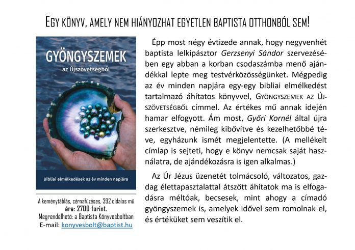 Épp most négy évtizede annak, hogy negyvenhét baptista lelkipásztor Gerzsenyi Sándor szervezésében egy abban a korban csodaszámba menő ajándékkal lepte meg testvérközösségünket. Mégpedig az év minden napjára egy-egy bibliai elmélkedést tartalmazó áhítatoskönyvvel Gyöngyszemek az Újszövetségből címmel. Az értékes mű annak idején hamar elfogyott. Ám most Győri Kornél által újraszerkesztve, némileg kibővítve és kezelhetőbbé téve egyházunk ismét megjelentette. (A mellékelt címlap is sejteti, hogy e könyv nemcsak saját használatra, de ajándékozásra is igen alkalmas.) Az Úr Jézus üzenetét tolmácsoló, változatos, gazdag élettapasztalattal átszőtt áhítatok ma is elfogadásra méltóak, becsesek, mint ahogy a címadó gyöngyszemek is, amelyek idővel sem romolnak el, és értéküket sem veszítik el.