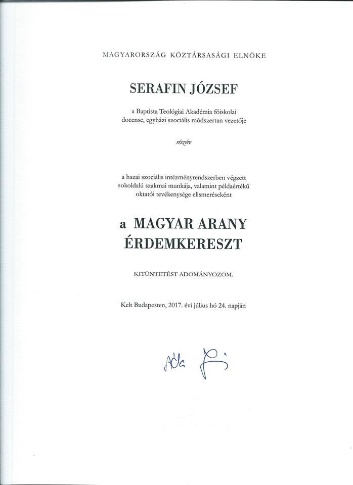 A kitüntetést a szociális területen végzett munkáért mint az egyházi módszertan vezetője, valamint a Baptista Teológiai Akadémia docense kapta. Elismerése egyben a baptista közösség, a szociális tevékenység elismerését is jelenti. Hálásak vagyunk Serafin József testvérünk eredményes, kiváló munkájáért!