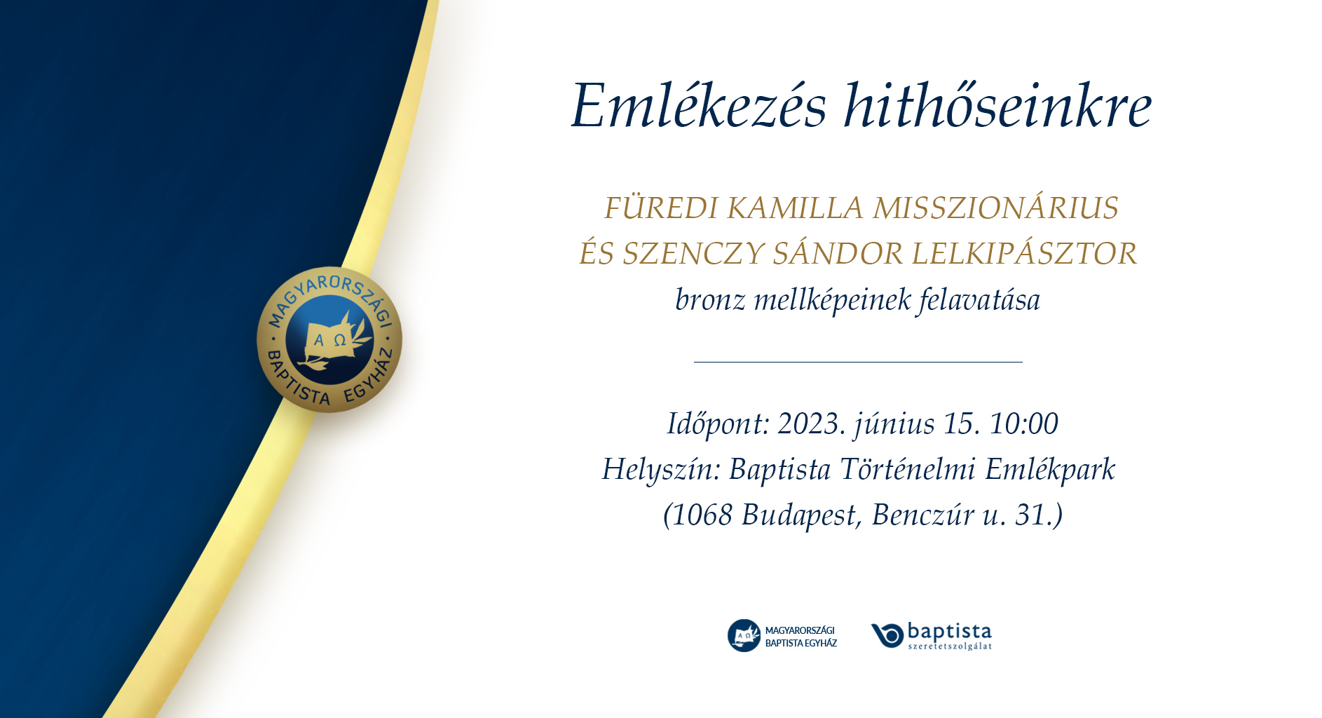 A Magyarországi Baptista Egyház és a Baptista Szeretetszolgálat szeretettel és tisztelettel hívja az érdeklődőket bronz mellképek avatására, amivel a magyarországi baptista közösség közelmúltjának két jeles alakja előtt tisztelgünk. Füredi Kamilla Afrikában szolgáló misszionáriusra és Szenczy Sándorra, a Baptista Szeretetszolgálat alapítójára emlékezünk.