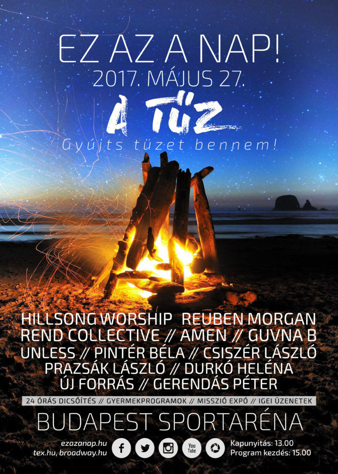 Május 27-én ismét megrendezzük a Kárpát-medencei hívők nagyszabású találkozóját a Budapest Sportarénában! Szeretettel hívunk benneteket, hogy közösen dicsőítsük Istent és átéljük a testvéri találkozás örömét. Idei eseményünk témája a tűz, a Szentlélek megjelenésének egyik szimbóluma.