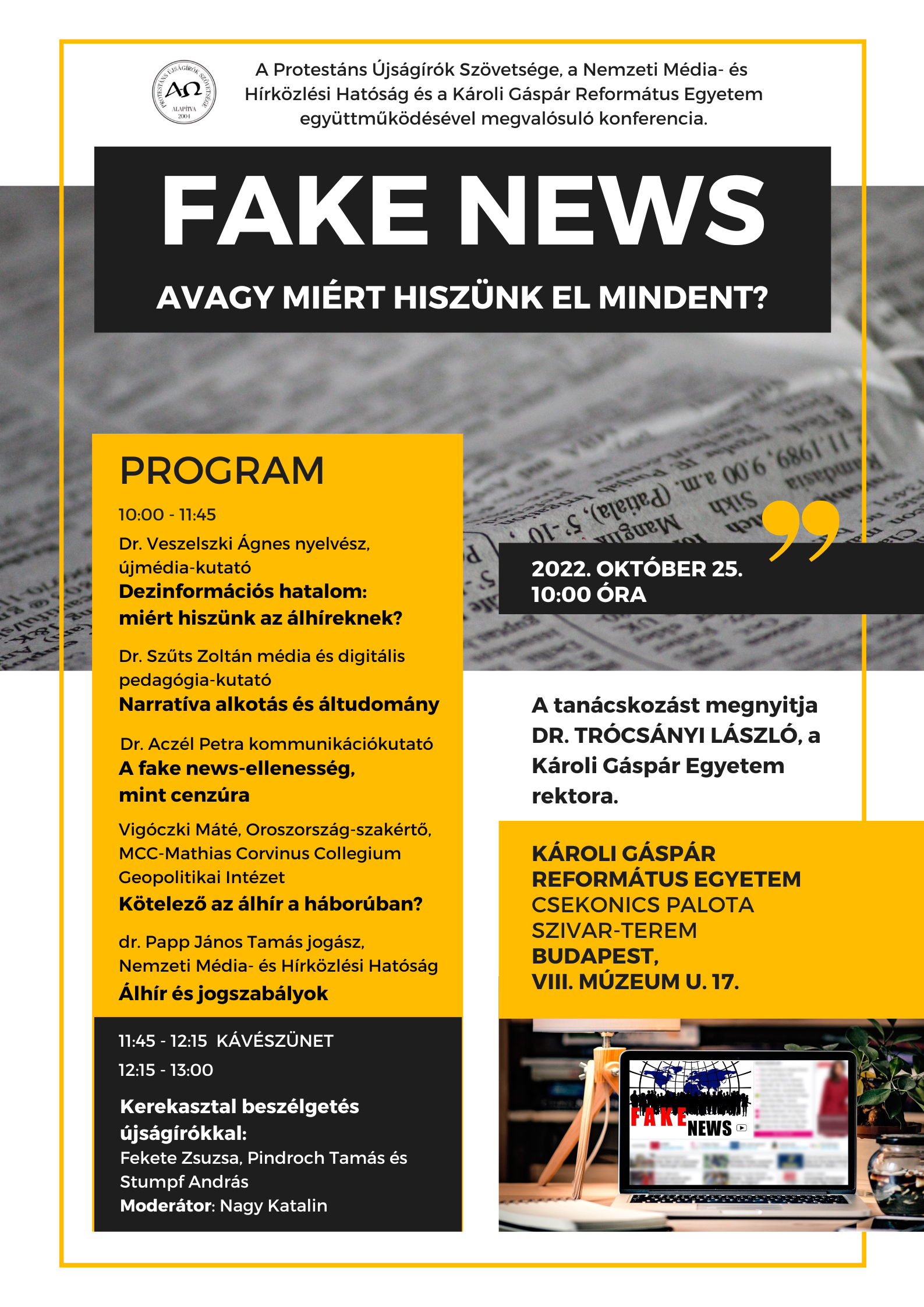 A Protestáns Újságírók Szövetsége meghívja Önt a Nemzeti Média- és Hírközlési Hatóság és a Károli Gáspár Református Egyetem együttműködésével megvalósuló konferenciára.