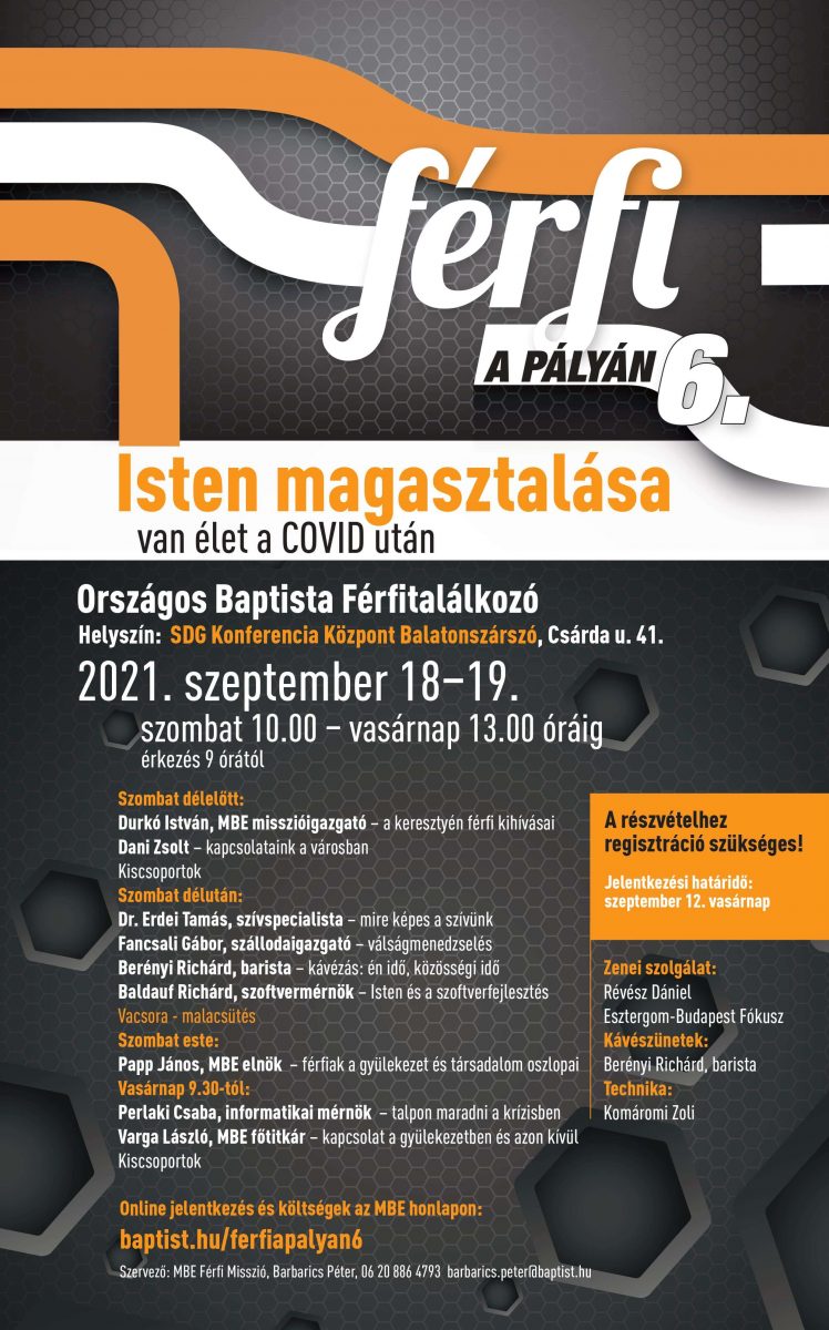2021. szeptember 18–19., szombat 10 órától vasárnap 13 óráig a balatonszárszói SDG Konferencia-központban kerül megrendezésre a hatodik Országos Baptista Férfitalálkozó. Jelentkezni szeptember 12., vasárnapig lehet az alábbi gombra kattintva: