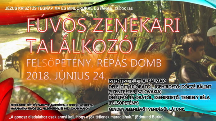 A most következő vasárnap, június 24-én lesz az idei répás-dombi fúvóstalálkozó, melyre szeretettel hívunk és örömmel várunk mindenkit: fúvószenészeket, családtagokat, barátokat, ismerősöket, gyülekezeti közösségeket.