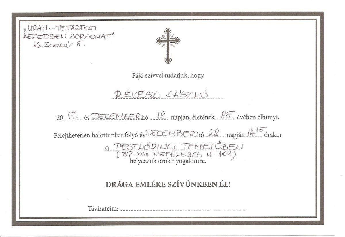 Fájó szívvel, de Isten akaratában megnyugodva tudatjuk, hogy hosszú és türelemmel viselt szenvedés után, a tegnapi napon szeretett testvérünk és szolgatársunk Révész László visszaadta lelkét Teremtőjének.