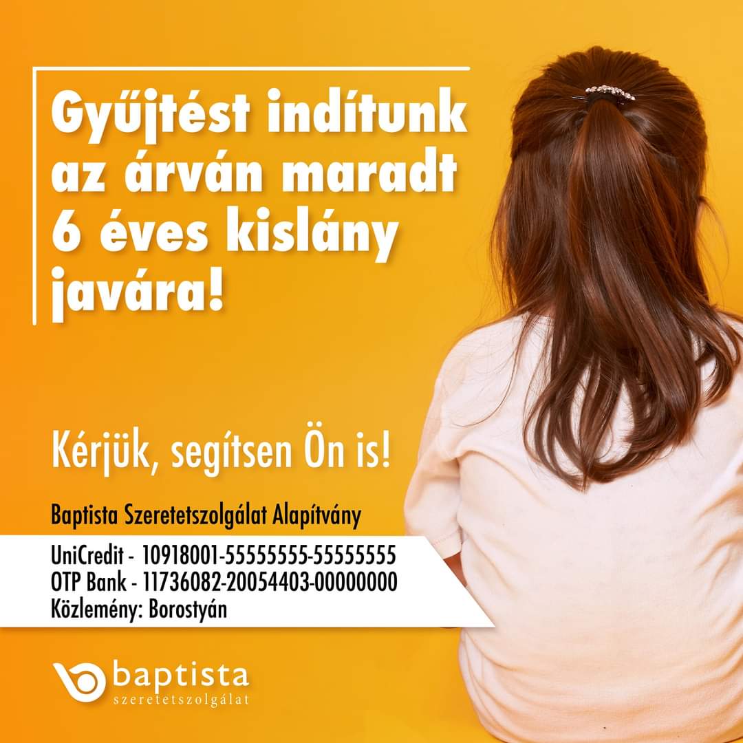 Gyűjtést indít az árván maradt hatéves kislány javára a Baptista Szeretetszolgálat