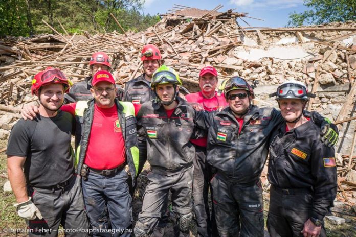 – Az összetartás a fő célja a gyakorlatnak – összegzett sisakját levéve egy rövid pihenő ideje alatt Pavelcze László, a csapat vezetője, a Baptista Szeretetszolgálat vészhelyzetkezelési igazgatója. Akinek a legközelebbi éles bevetése éppen a 60. lesz. Elmondta: az amerikai, Észak-Karolinából és Texasból érkezett kollégákkal a 600 lelkes kis faluban úgy tudnak valós körülmények között gyakorlatozni, hogy ehhez nincs szükség különösebb anyagi ráfordításra. Nem kell ugyanis egy viszonylag ép házat szétdönteni, akadt olyan, amit a helyi önkormányzat eleve lebontásra ítélt. A telken – amit a mentőcsapat elvonulása után közmunkások tisztítanak majd meg a törmeléktől – éppen egy katasztrófavédelmi kiképzőbázis létesül majd.