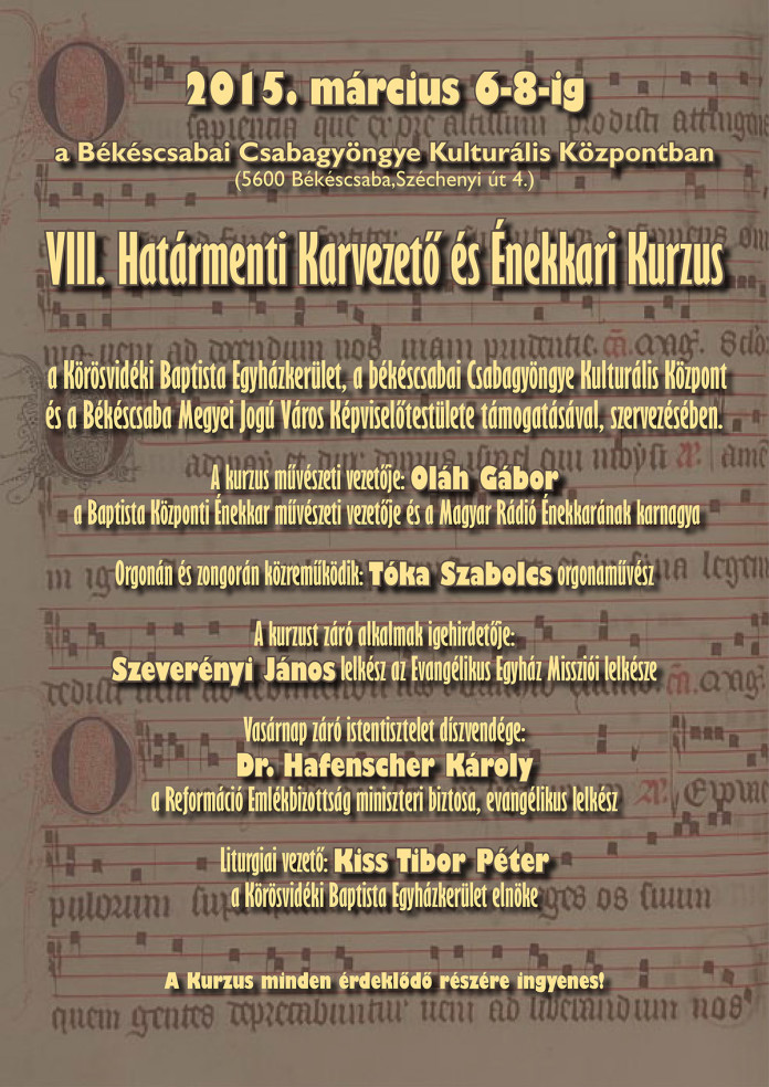Ez alkalommal köszöntötte az ünneplő gyülekezetet Szente Béla a Kulturális Központ igazgatója, aki örömmel adja át minden évben ezt az impozáns termet, éttermet ezekre az alkalmakra. Majd Békéscsaba város polgármestere Szarvas Péter köszöntőjében elmondta, kiváltságnak tekinti, hogy a baptistáknak ily módon is segítségére lehet. Köszönetünket fejezzük ki ifj. Bálint József testvérnek is, aki mindent félretéve szervezte meg nagy odaadással – felesége segítségével – ezeket az alkalmakat. Földesi Zoltán testvér nyomdájában ismét igényes, szép kivitelű kotta- és zenei anyag segítette a hétvégi kórus munkáját.