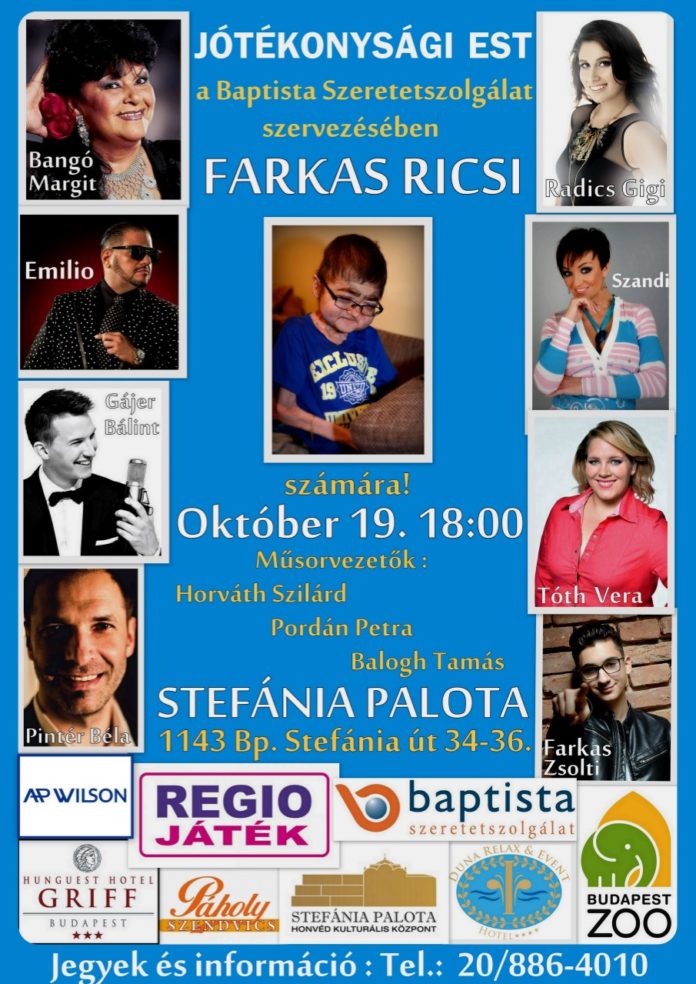 A Baptista Szeretetszolgálat jótékonysági estet szervez Farkas Ricsi számára október 19-én 18 órakor a Stefánia-palotában.