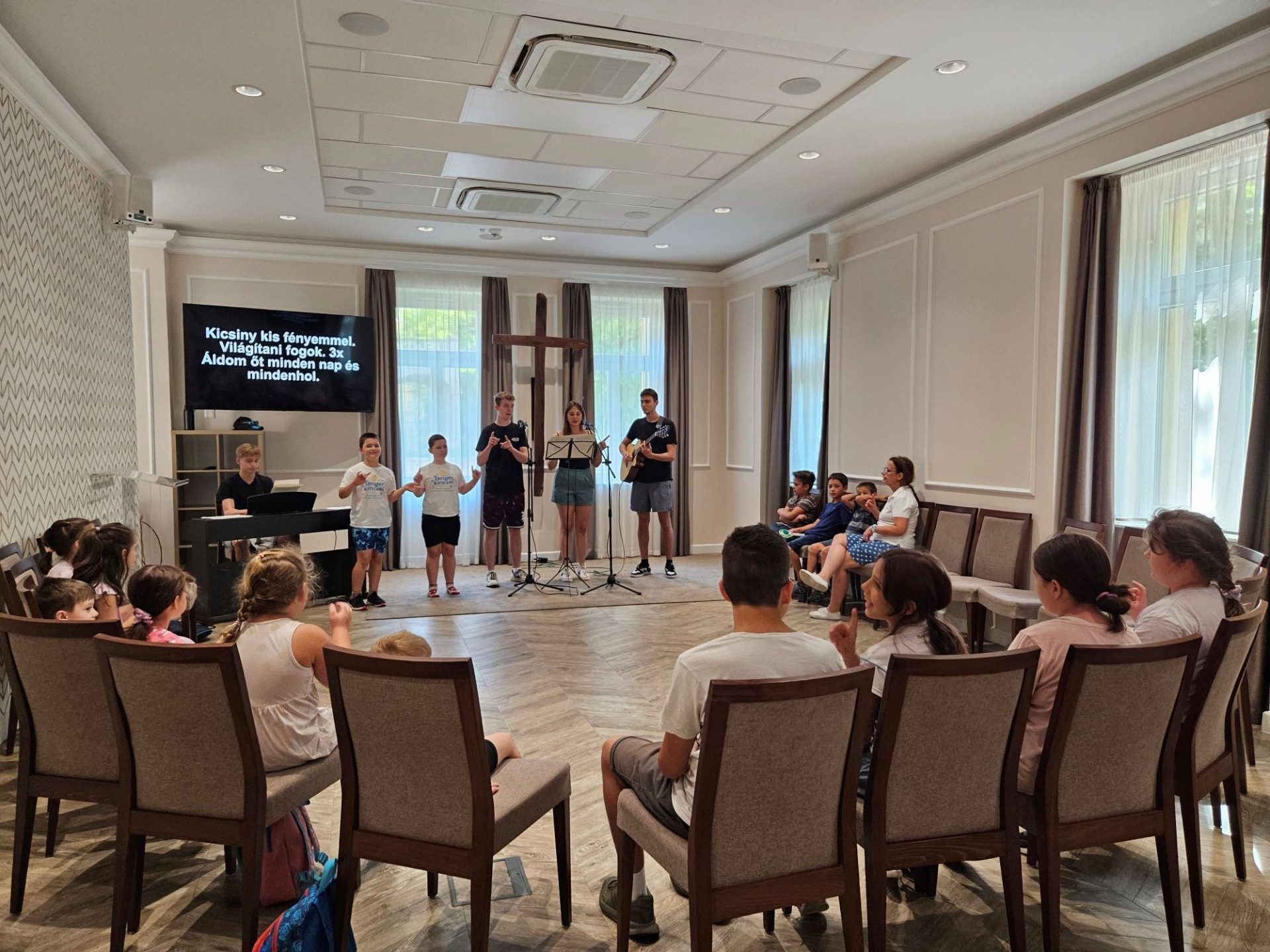 A gyerekek sokszínű programból választhattak: minden reggel tornával, majd zenével kezdtünk, amiben a Budafoki Gyermek Dicsőítő Csapat segített, majd interaktív áhítatokon vettünk részt. Volt foci, mozgásos játékok, kézműveskedés, arcfestés, a Palánta Misszió vidám evangelizációja egy bohóccal, egy keresztény társasjátékos csapat, valamint a Mancs a Kézben Alapítvány két mentőkutyája tették emlékezetessé a hetet.