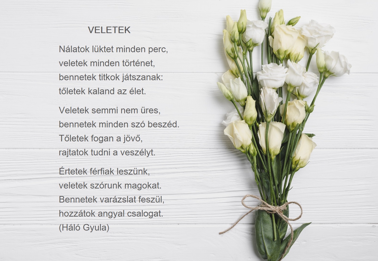 Akár gyerekek vagytok vagy már felnőttek, akár lányok vagy asszonyok, akár egyedül éltek vagy párotokkal, nagy szeretettel gondolunk rátok, a nőkre, és nem csak ezen a napon. Mert csak veletek, a nőkkel kerek a világ. Tőletek vagyunk férfiak. Veletek bármire képesek vagyunk, mert nő és férfi együtt az ember. Ezt fejezi ki az alábbi vers is.