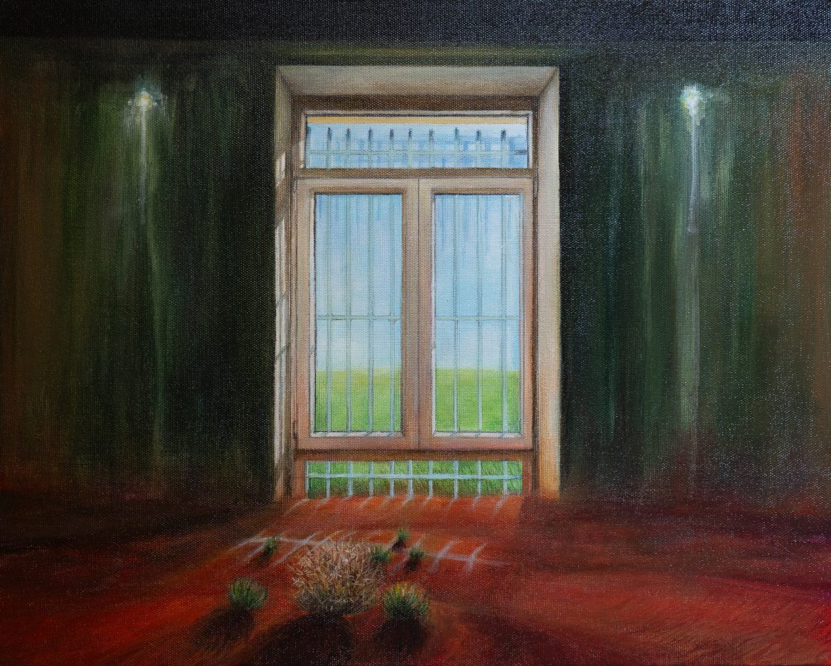Alkotóhéten készült festményem központi motívuma az ablak mint kapuszimbólum: átlépési lehetőség a földi-szellemi sík, az ember és Isten között. A festményemen e „kapu” zárva van, erre a zártságra erősít rá a rács és a kilincs hiánya.