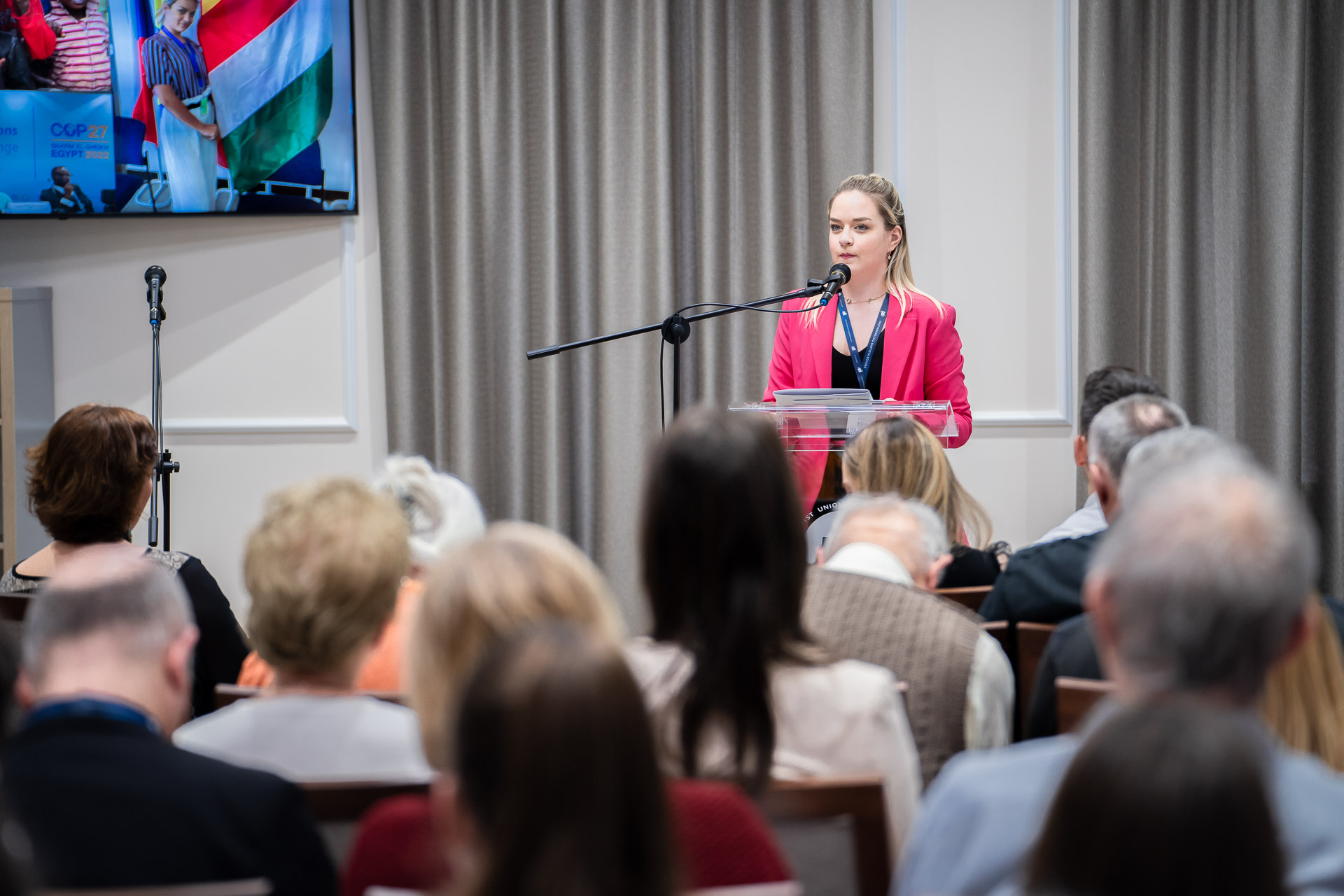 Horváth Sándor és Kiss Fanni „Klímaváltozás és globális felmelegedés. Kinek a kezében van a döntés, a következő generáció élete?” előadásukban bemutatták a BSZA Climate of Change programját, a projekt céljait, eredményeit és a klímaváltozás globális kihívásaira adott válaszokat, hangsúlyozva a következő generáció lehetőségeit a változások kiharcolására.